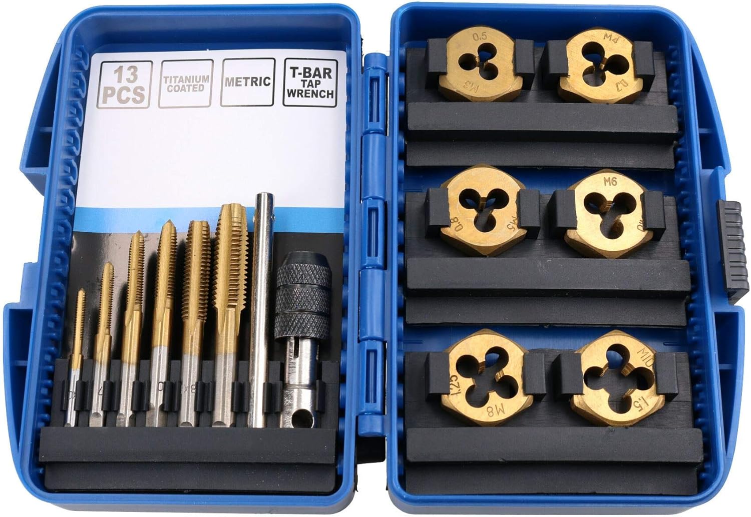 Titanium coated metric tap and die set for commercial or occasional use 13pc Metric tap and die set Titanium coated alloy steel strengthens the cutting edge for maximum strength and durability each time Contains 6 metric taps and 6 metric Die nuts Die nuts as well as the die holders can also be used with sockets or spanners perfect for use in restricted areas SET INCLUDES THE FOLLOWING 6 x Metric Taps-M3 x 0.5, M4 x 0.7, M5 x 0.8, M6 x 1.0, M8 x 1.25 and M10 x 1.5 6 x Metric Die Nuts-M3 x 0.5, M4 x 0.7, M5 x 0.8, M6 x 1.0, M8 x 1.25 and M10 x 1.5 1 x T Bar Style Tap Wrench Comes in a blow molded case for easy storage and transportation