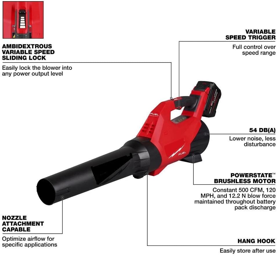 The for Milwaukee.. M18 FUEL dual batery blower is powered by a POWERSTAT brushless motor that delivers 600 CFM and 145 MPH. It constantly blows powerful air throughout the full charge of the batery compared to all handheld gas blowers. It reaches to full throttle in just under 1 second thereby boosting productivity and control. The speed control mechanism combined with the optimized balance offers best in class clearing control. Variable speed trigger provides added user control while allowing you to easily work on demanding applications like clearing wet leaves. REDLNK PLUS intelligence has total system communication between the tool and batery for unmatched levels of performance, protection, and productivity. It uses two M18 REDLITHUM bateries (sold separately) to operate and delivers high output on full charge. It comes with tapered as well as flat nozzle attachments and optimizing airflow for different applications.