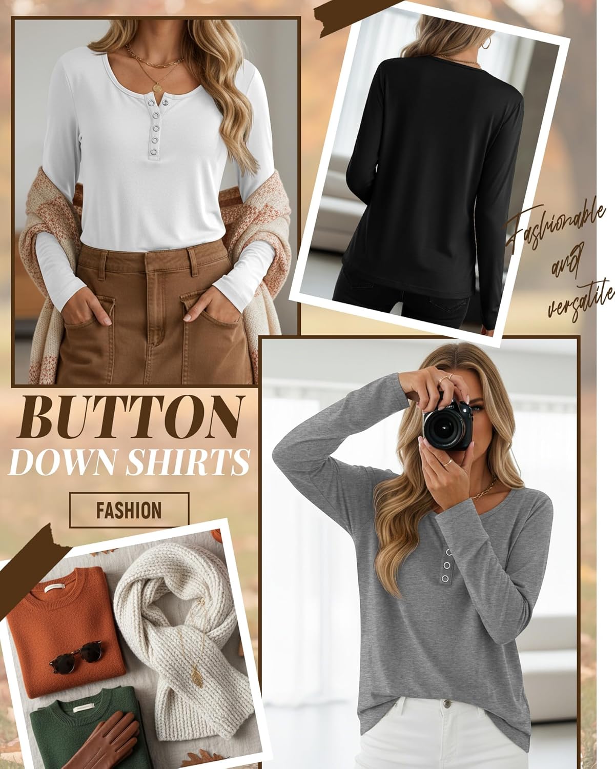 Features: The button-down front details allow our women's long-sleeve henley tops to show off the neckline and add feminine charm. A soft, breathable, and structured henley button top will keep you looking stylish and pair with a cape, cardigan, coat, or jacket to help you make a statement this fall and winter. Specifications: Material: 60% Polyester, 35% Cotton, 5% Spandex Package includes: 3 x Women's long sleeve button tops Notes: Manual measurement, please allow slight errors on size. The color may exist a slight difference due to different screen displays