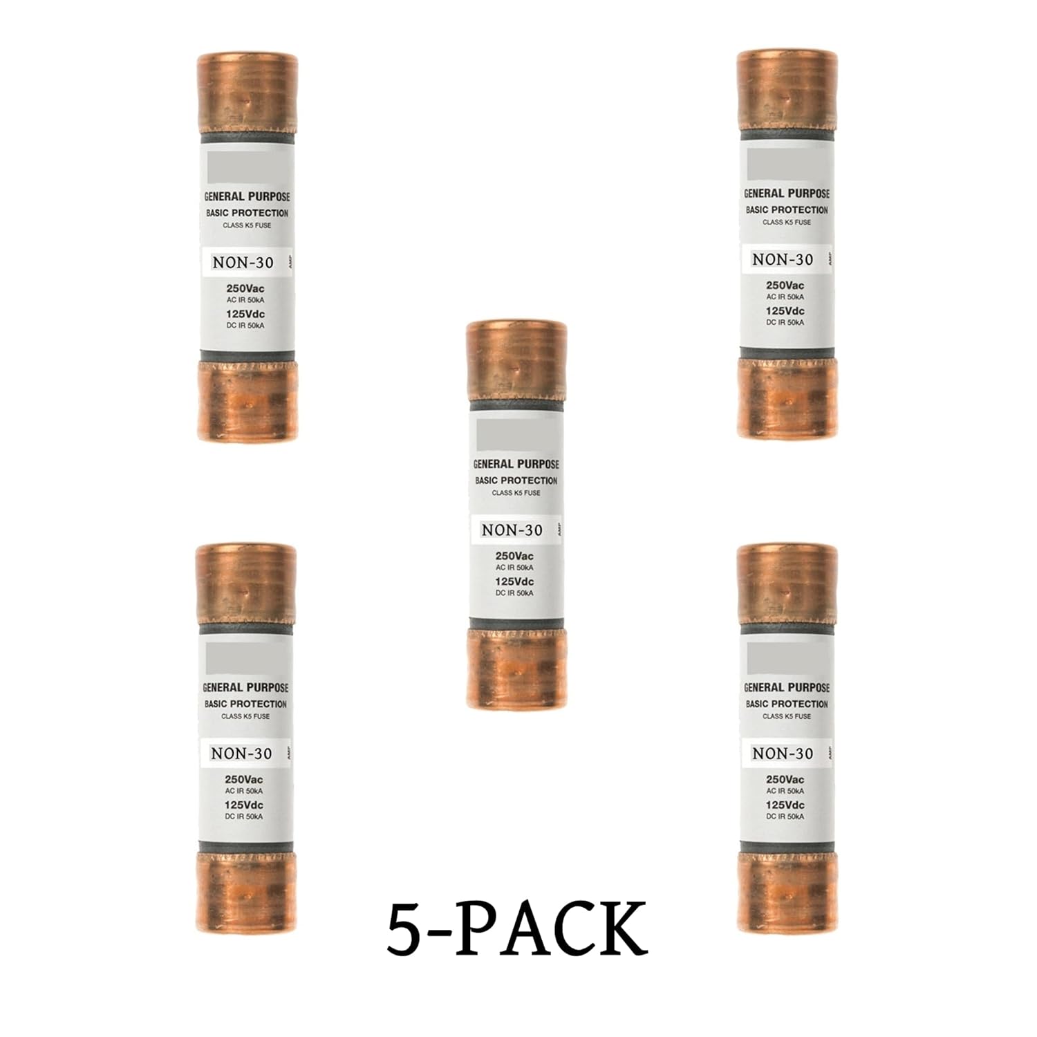 Part number: NON-30A, in box and pack of 5 PACK Protect lighting, heating, and other circuits not subject to temporary surges and where available short-circuit currents are relatively low ONE-TIME fuses do not have a time delay feature and thus should not be specified in circuits where large transients or motor overloads occur For motor circuits, size at 300% to 400%