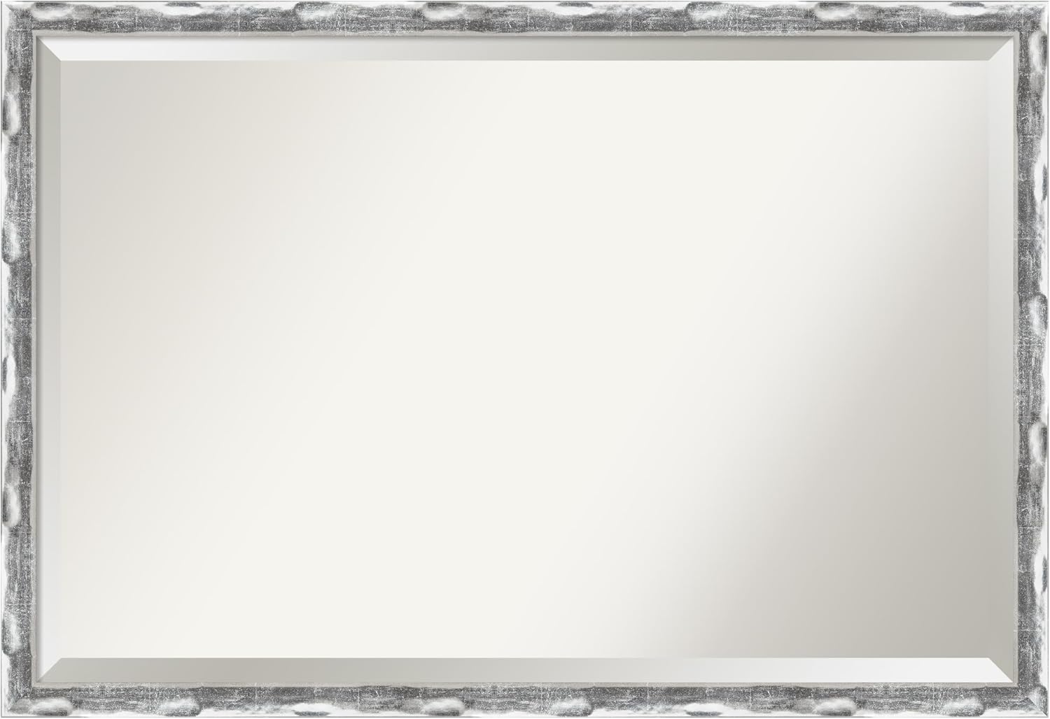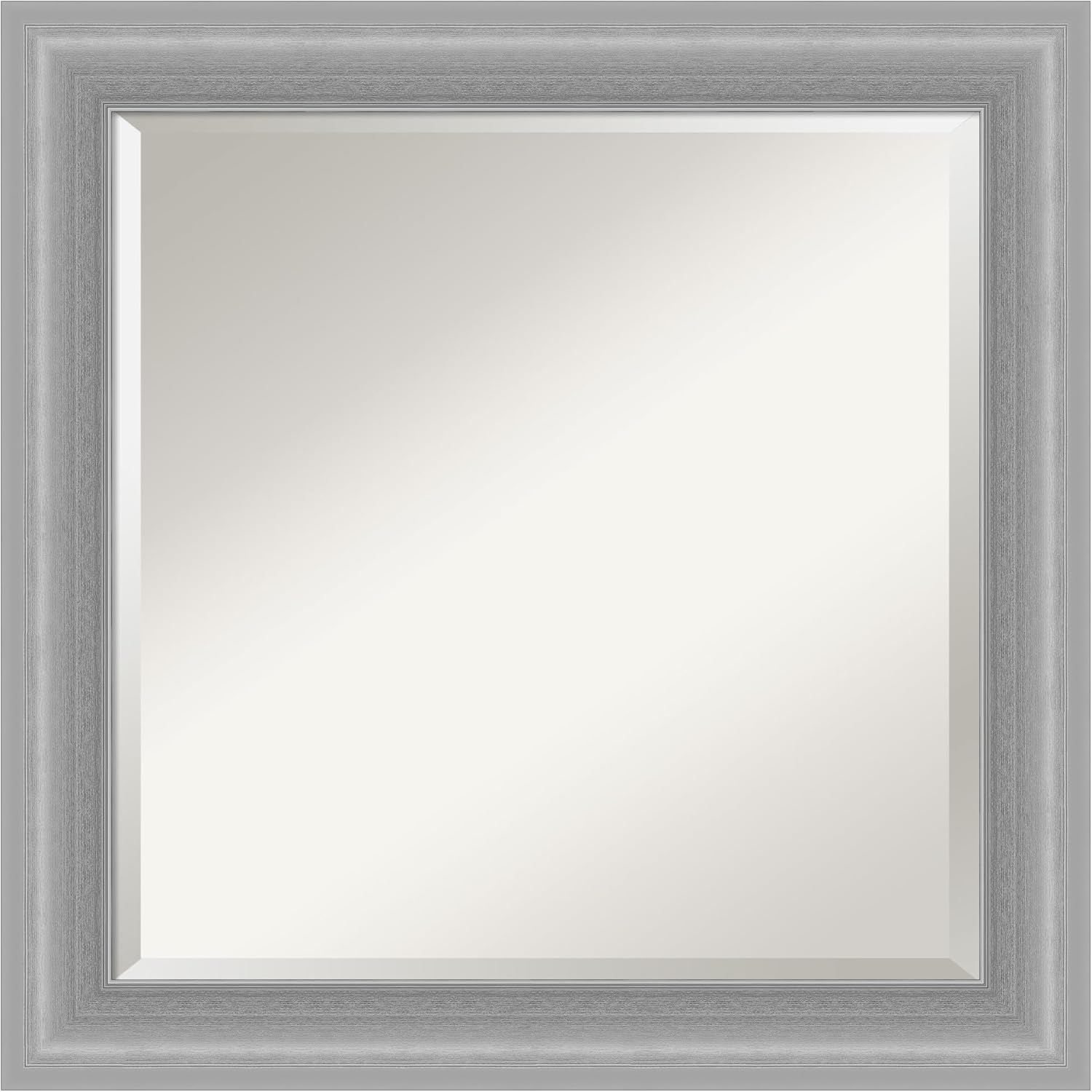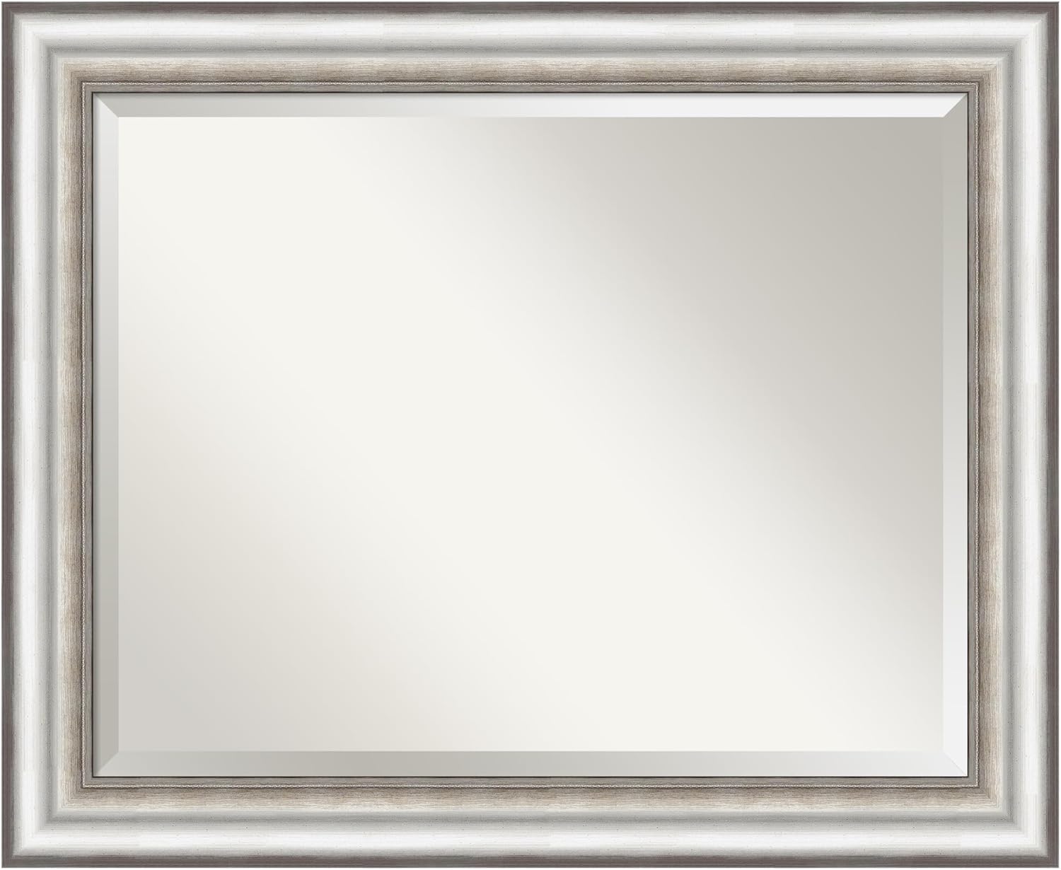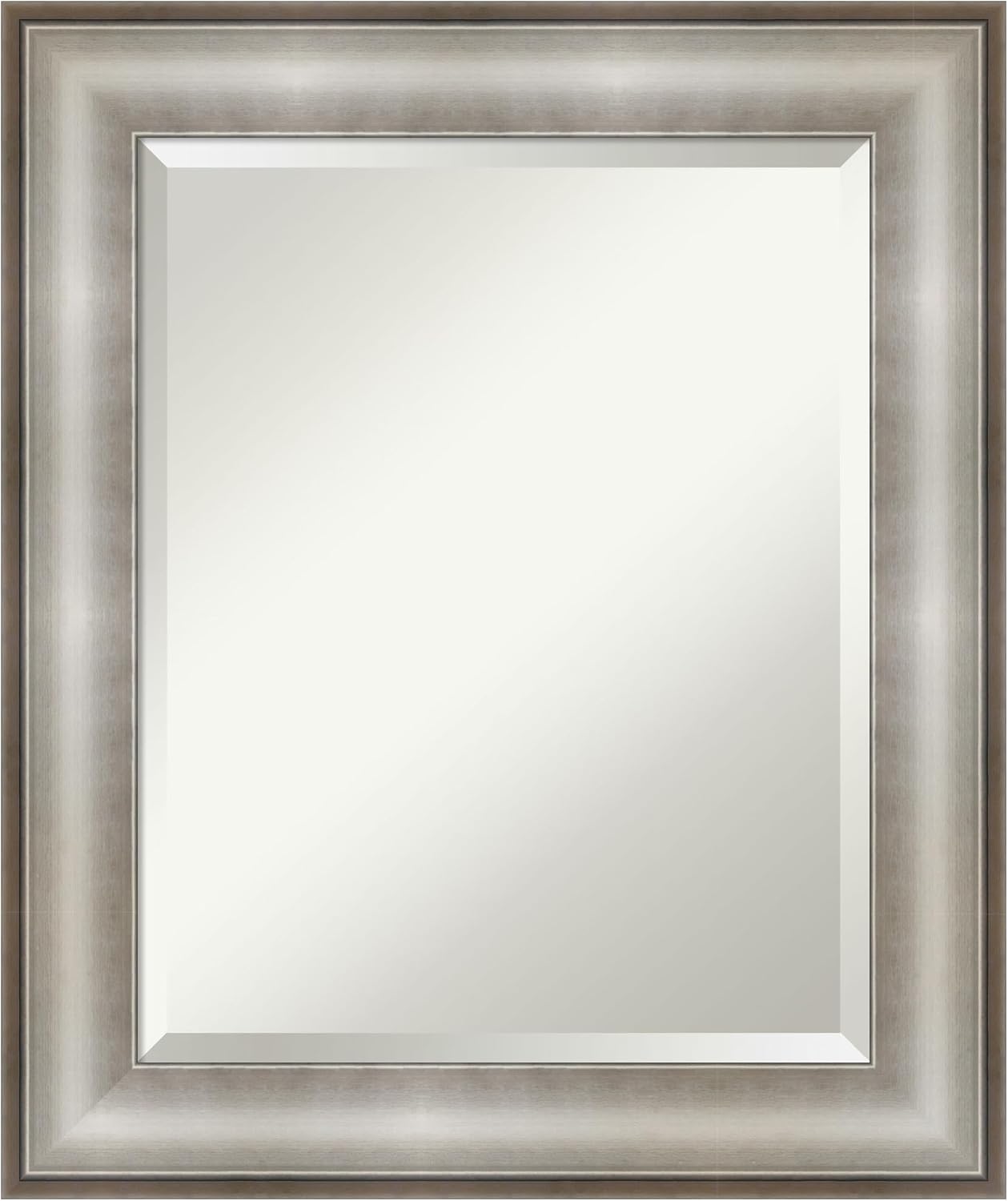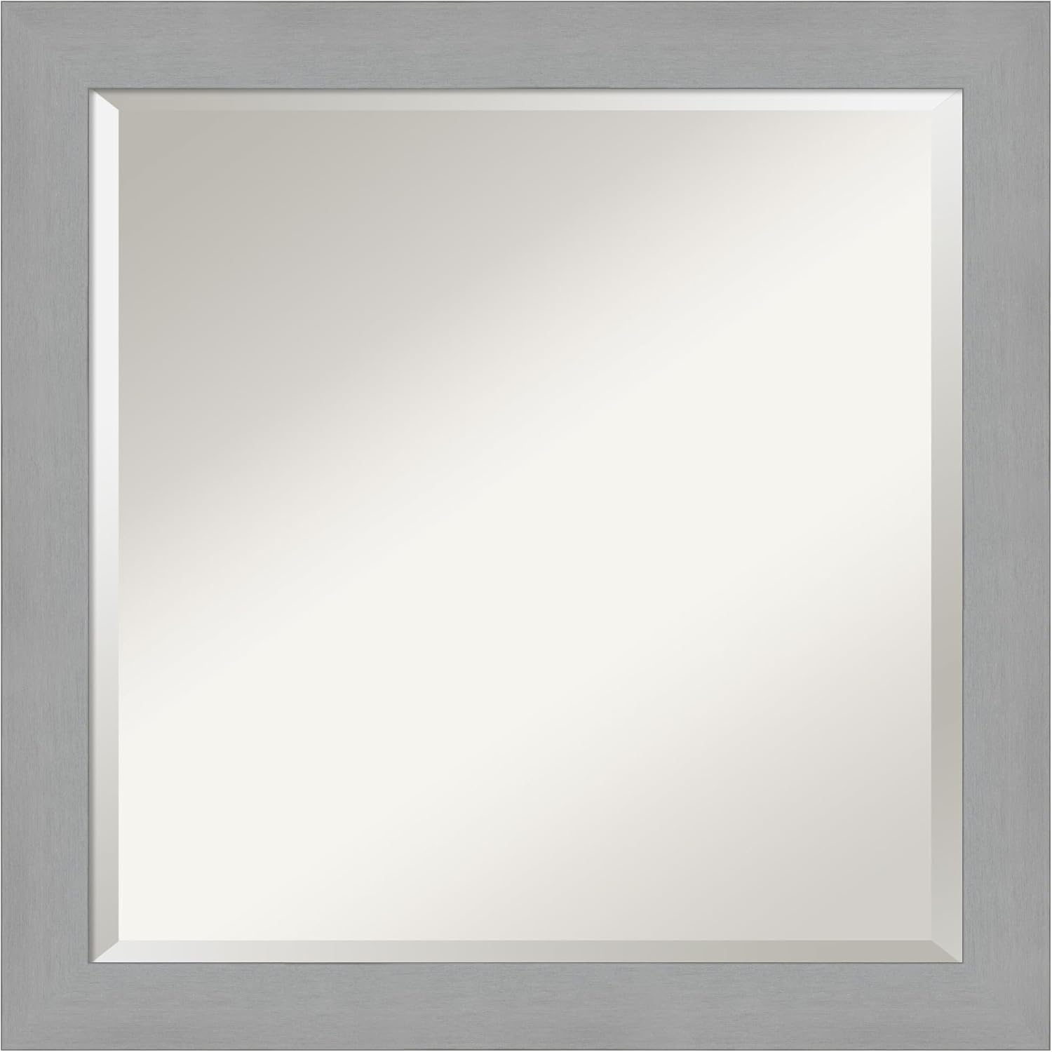 PRODUCT: Amanti Art Beveled Wall Mirror; OUTER SIZE: Exactly 32.25 x 26.25 inches; FRAME: Vista Brushed Nickel; FRAME FINISH: Brushed Nickel; FRAME COLOR: Silver. The Vista Brushed Nickel frame is a wide, flat brushed metallic light silver frame with smooth matte silver inner and outer edges. Give your home or office the finishing touch with this framed wall mirror. Individually made using traditional custom framing techniques, it has the quality you would expect from your local frame shop. It holds its value with premium finishing that can be appreciated up close. Because of our attention to detail and focus on artistry, architects, interior designers, and homeowners alike choose this mirror to create beautiful living spaces.
