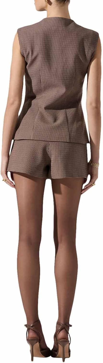 Elevated blazer style vest features collarless neckline and fit & flare shape in a fall-forward micro plaid pattern. Pairs back to the Gisselle Shorts.