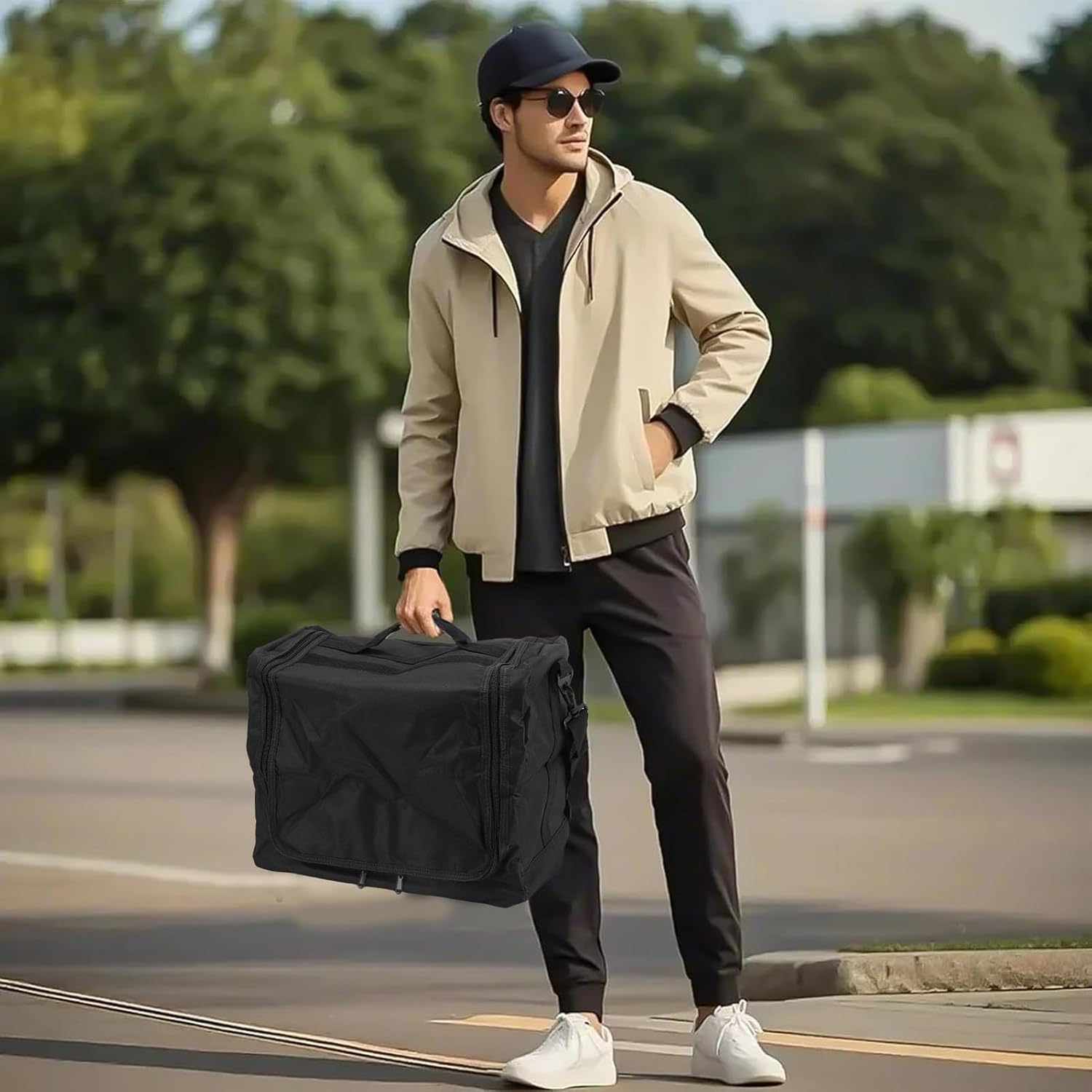 1. Spacious Storage Capacity: This hat bag features a large capacity designed to store multiple baseball hats efficiently. The layout maximizes space utilization while maintaining an organized structure. 2. Dust Proof: Constructed with dust proof materials that create a protective barrier around your hats, shielding them from environmental contaminants. This helps maintain your hats' original appearance and shape, ensuring they remain fashionable and ready to wear. 3. Fashionable: Boasts a minimalist aesthetic that appeals to both men and women, serving as a practical accessory that complements your style. It is suitable for casual outings and business travel. 4. Multi Purpose: Beyond baseball hat storage, this bag adapts to various organizational needs. It accommodates different hat styles, while also functioning as a general storage solution for accessories, enhancing its practical value. 5. Portable: Engineered for portability with a lightweight build, comfortable handle, and adjustable shoulder strap offering multiple carrying options. The construction withstands frequent use, while the smooth gliding two way zip ensures easy access and secure closure. Spec: Item Type: Hat Bag Material: Canvas Weight: Approx. 905g / 31.9oz Product Size: Approx. 40x25x35cm / 15.7x9.8x13.8in Package List: 1 x Hat Bag 1 x Shoulder Strap