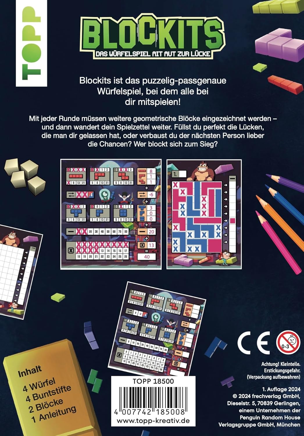 Würfel werfen, Blöcke platzieren, Plätze blockieren! Spaßig, dynamisch, originell: Blockits macht Schluss mit dem Gewürfel, bei dem alle nur auf ihre eigenen Zettel starren! In jeder Runde bestimmen die Würfel, welche geometrischen Blöcke eingezeichnet werden müssen – dann wandert dein Spielzettel auch schon weiter. So musst du immer auf Zack sein und es kommt keine Sekunde Langeweile auf. Und wenn du deine Möglichkeiten nicht geschickt nutzt, ist rasch GAME OVER!Füllst du perfekt die Lücken, die man dir gelassen hat, oder verbaust du der nächsten Person lieber die Chancen? Wer blockt sich zum Sieg?Inhalt:4 Würfel4 Buntstifte1 Spielblock1 Wertungsblock1 AnleitungSpielprinzip:Alle Würfel werden gewürfelt – nimm dir einen, gib die anderen weiter.Zeichne die gewürfelte Form auf deinem Spielzettel ein. Notiere außerdem das Ergebnis auf deinem Wertungsblock.Du behältst deinen Wertungsblock, aber gibst deinen Spielzettel weiter. Die nächste Runde spielst du auf einem neuen Zettel!Kannst du Reihen vervollständigen und Punkte kassieren – oder wurdest du geblockt?2–4 Personen | Ab 8 Jahren | 20 Minuten Spielzeit