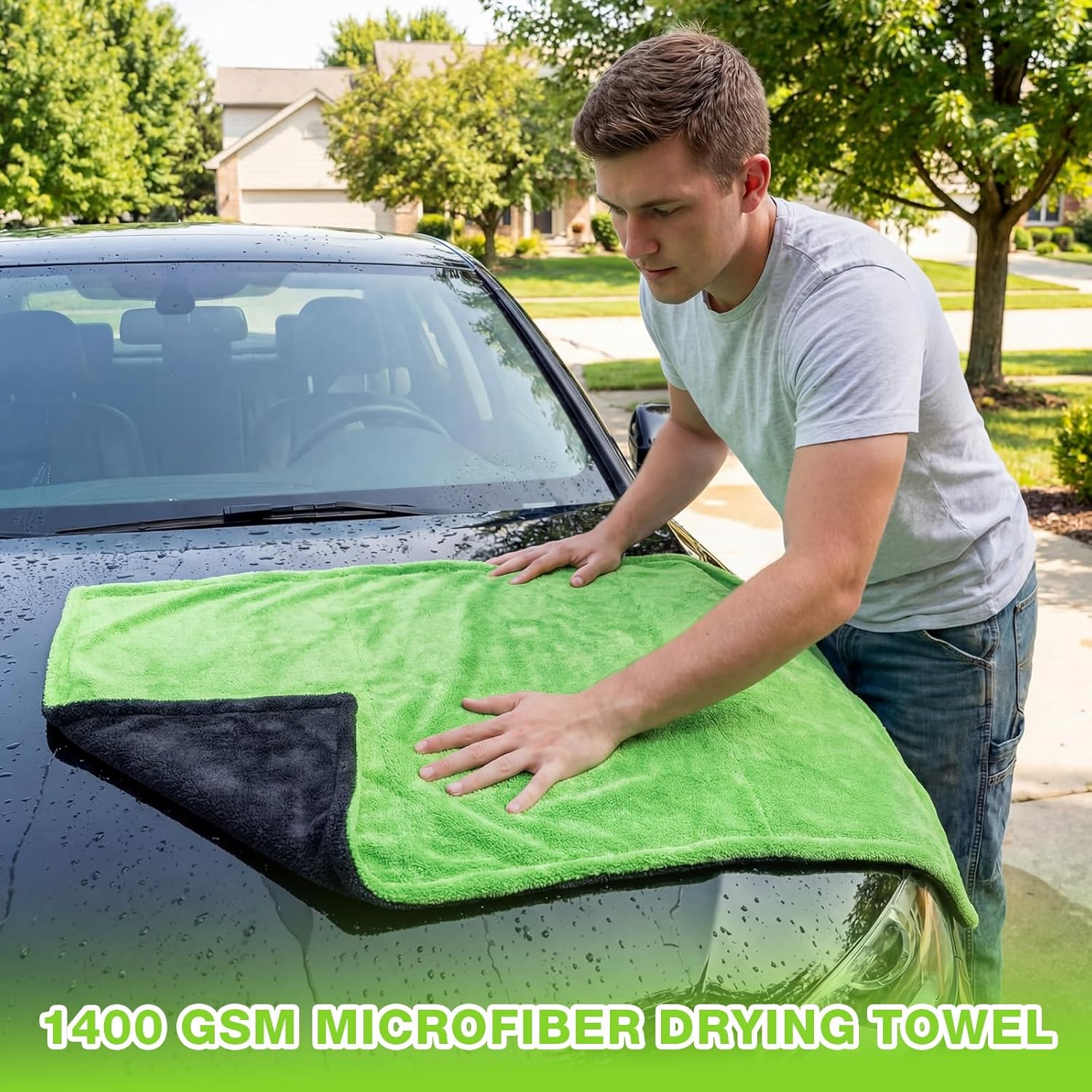 Features: Built for long-term use, these heavy-duty drying towels maintain absorbency and softness after repeated washes. Soft microfiber fibers glide gently over paint, glass, and trim without scratching, making it safe for all vehicle surfaces. Specifications: Material: 1400 GSM microfiber Color: dark gray, green Size: 24 x 48 inches/ 60 x 120 cm Package includes: 2 X Microfiber car drying towels Notes: Manual measurement, please allow slight errors on size. The color may exist a slight difference due to different screen displays
