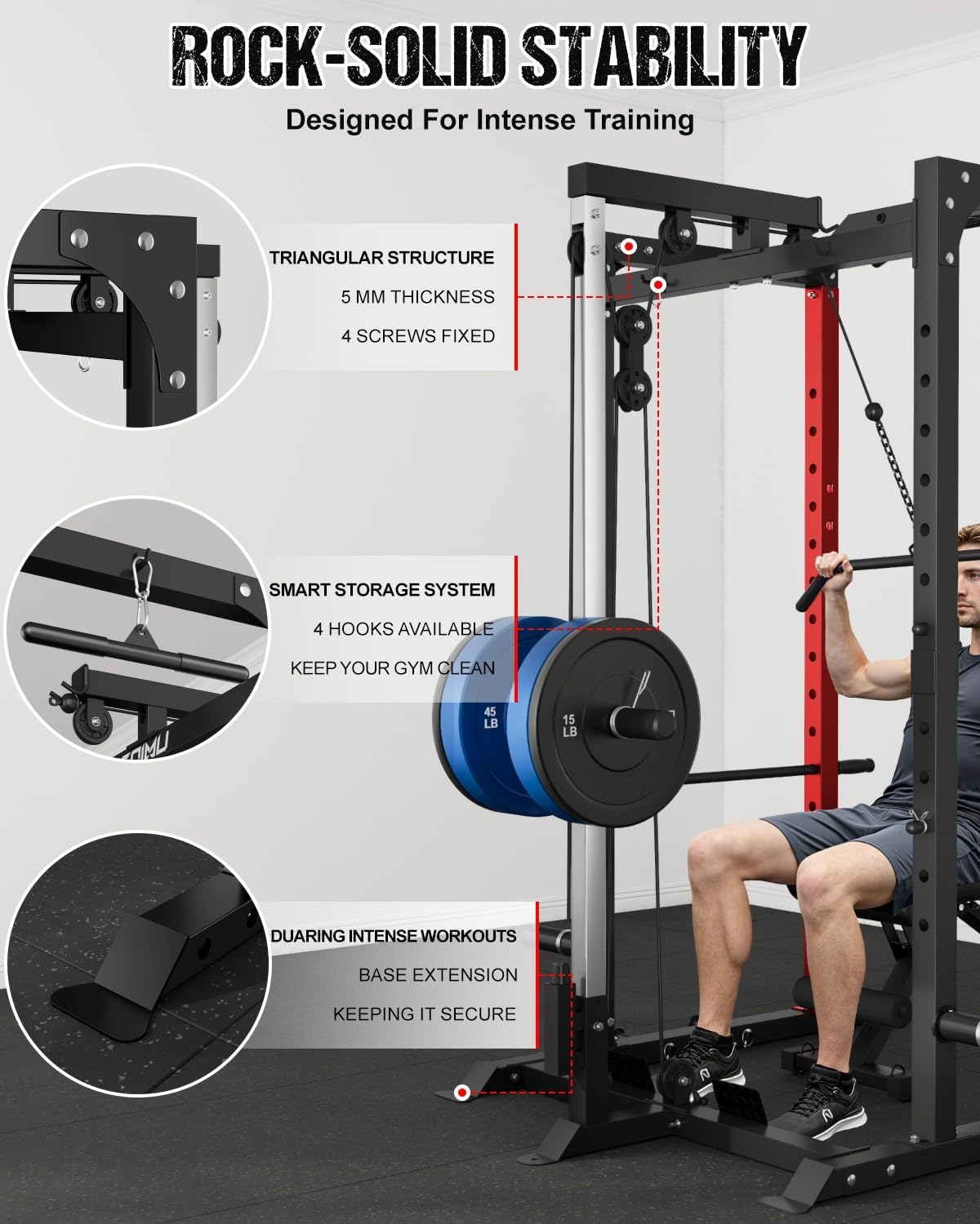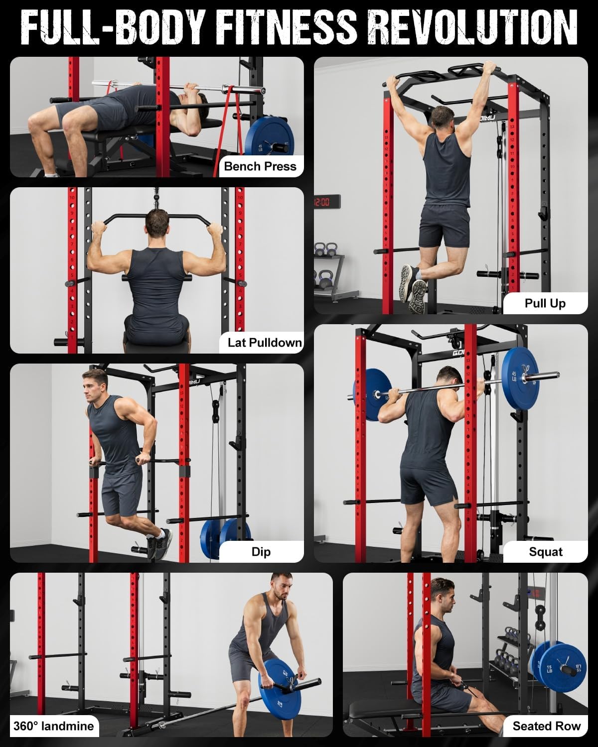• 【Endless Workout Possibilities】: Whether you're a beginner or a seasoned athlete, the GOIMU C1 Power Cage is designed to grow with you. Includes over 30+ accessories: 1 triceps rope, 1 T-bar, 1 pull down bar, 2 J-hooks, 6 counterweight racks with clamps, 1 360 degree landmine, and more. Everything you need to customize your workouts and maximize your training potential is right at your fingertips.