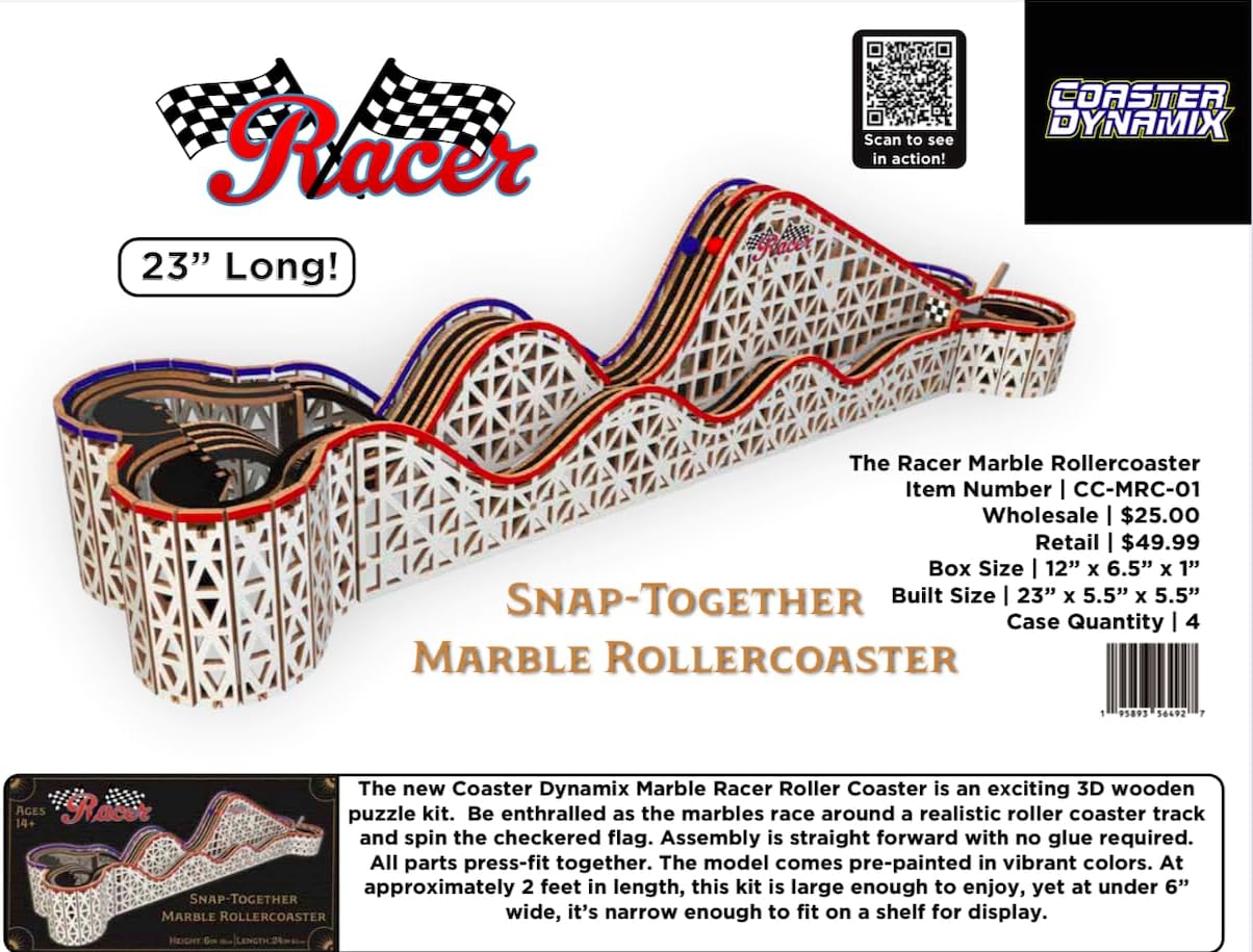 Looking for the PERFECT gift? A good bonding activity? An intricate puzzle? This is for you! This kit is guaranteed to keep you entertained AND work as a great piece of decor. How?! DURABLE PARTS - Unlike other model kits, our parts are made from durable wood made to withstand the process of modeling, and won’t snap under pressure. This Marble Racer Roller Coaster is an exciting 3D wooden puzzle kit. Be enhralled as the marbles race around a realistic roller coaster track and spin the checkered flag. Assemble is straight forward with no glue required. All parts press fit together. The model comes pre-painted in vibrant colors. At approximately 2 feet in length, this kit is large enough to enjoy, yet under 6" wide, it's narrow enough to fit on a shelf for display.