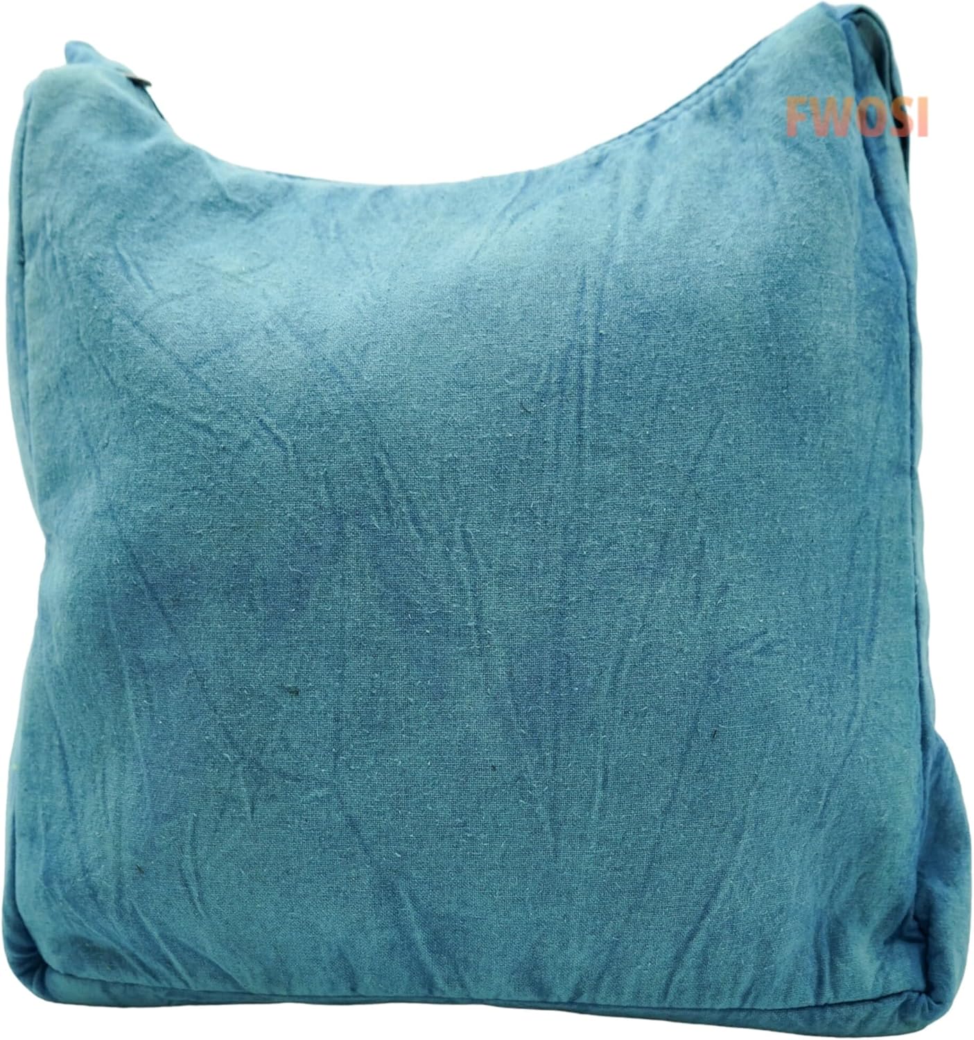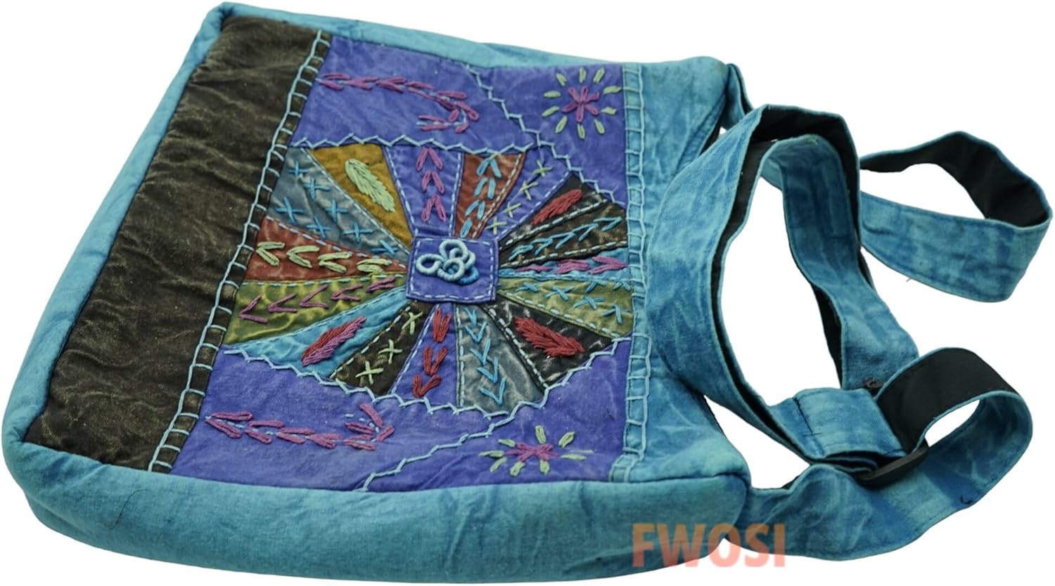 Discover the artisanal beauty of this handcrafted cotton messenger bag by FWOSI, featuring a stunning bohemian design with intricate embroidery work. The bag showcases a vibrant purple and teal color scheme with a mesmerizing sunburst pattern adorned with detailed stitching and multi-colored patches. Perfect for daily use, festivals, or travel, this lightweight bag weighs just 190 grams while offering practical functionality. The spacious main compartment includes a security pocket to keep your valuables safe. With dimensions of 12 x 11 x 3 inches, it provides ample space for your essentials while maintaining a comfortable profile. The adjustable 60-inch strap allows for versatile wearing options - use it as a crossbody bag or shoulder bag to suit your style. Each bag is individually handcrafted in Nepal using premium cotton fabric with durable stitching and smooth zippers. The unique design and practical features make it an ideal choice for those seeking both style and functionality in their everyday bag.