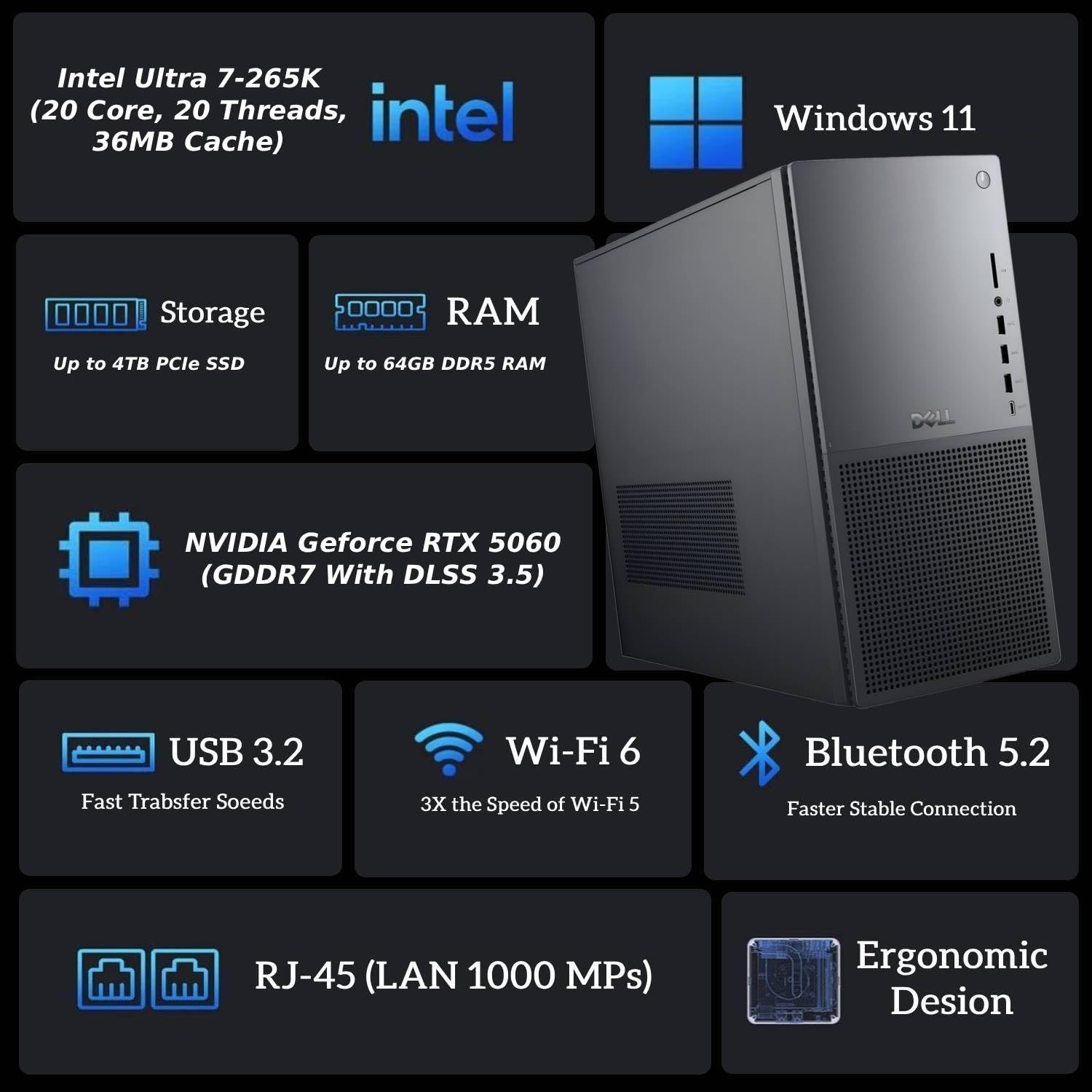 Dell 2025 New XPS Version, EBT1250 Ultra Series Business Desktop 50 Series Dedicated Graphics Card, GDDR7 Processor: Ultra 7-265K 5.7GHz Processor ( 36MB Cache, 20-Cores, 20-Threads, 8 Performance-cores) Storage: Up To 8TB PCIe SSD (Solid State Drive) Memory: Up To 64GB DDR5 Memory Graphics: GeForce RTX 5060 Graphics Operating System: Windows 11 Connectivity:, Ethernet LAN (RJ-45) Input/Output:, Black, Dell Standard USB Keyboard, USB Mouse Ports/Slots:, 9 USB 3.0, 2 USB-C. 1 HDMI, SD Card Reader, Headphone/Microphone Combo Jack Color: Black Form/Style: Desktop Product Dimensions (WxLxH): 12.76 IN x 6.06 IN x 11.53 IN Weight: 12.02lb