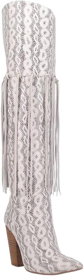 The Kitty Kat Snake Snip Toe Boots From Dingo Are Made For Those Not Afraid To Walk On The Wild Side. Featuring A 20 Inch Snake Print Leather Shaft And White Fringe Detail. With A Side Zip Closure For Secure Fit And Cushioned Insole For Comfort. These Boots Are Made For Strutting.