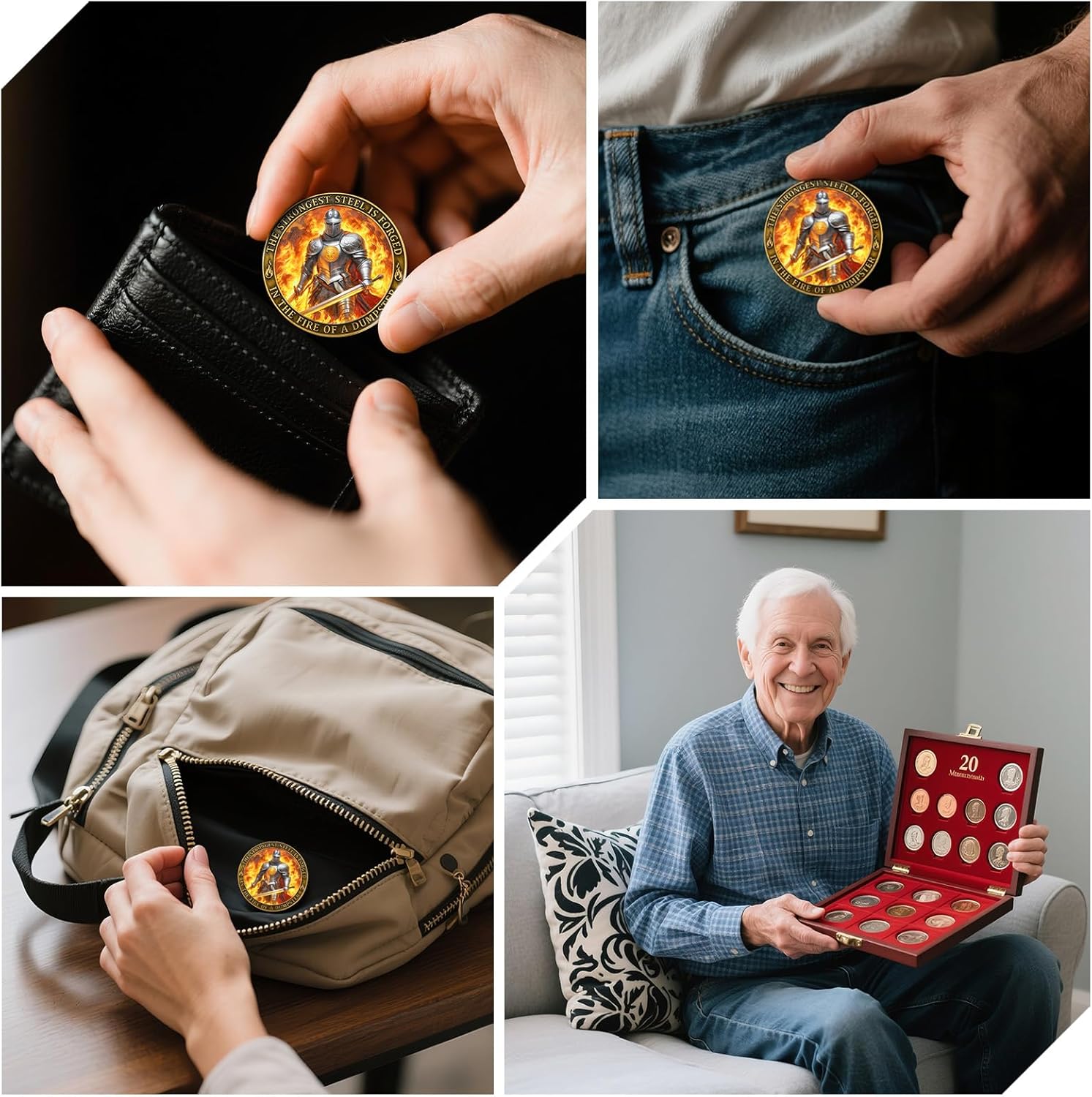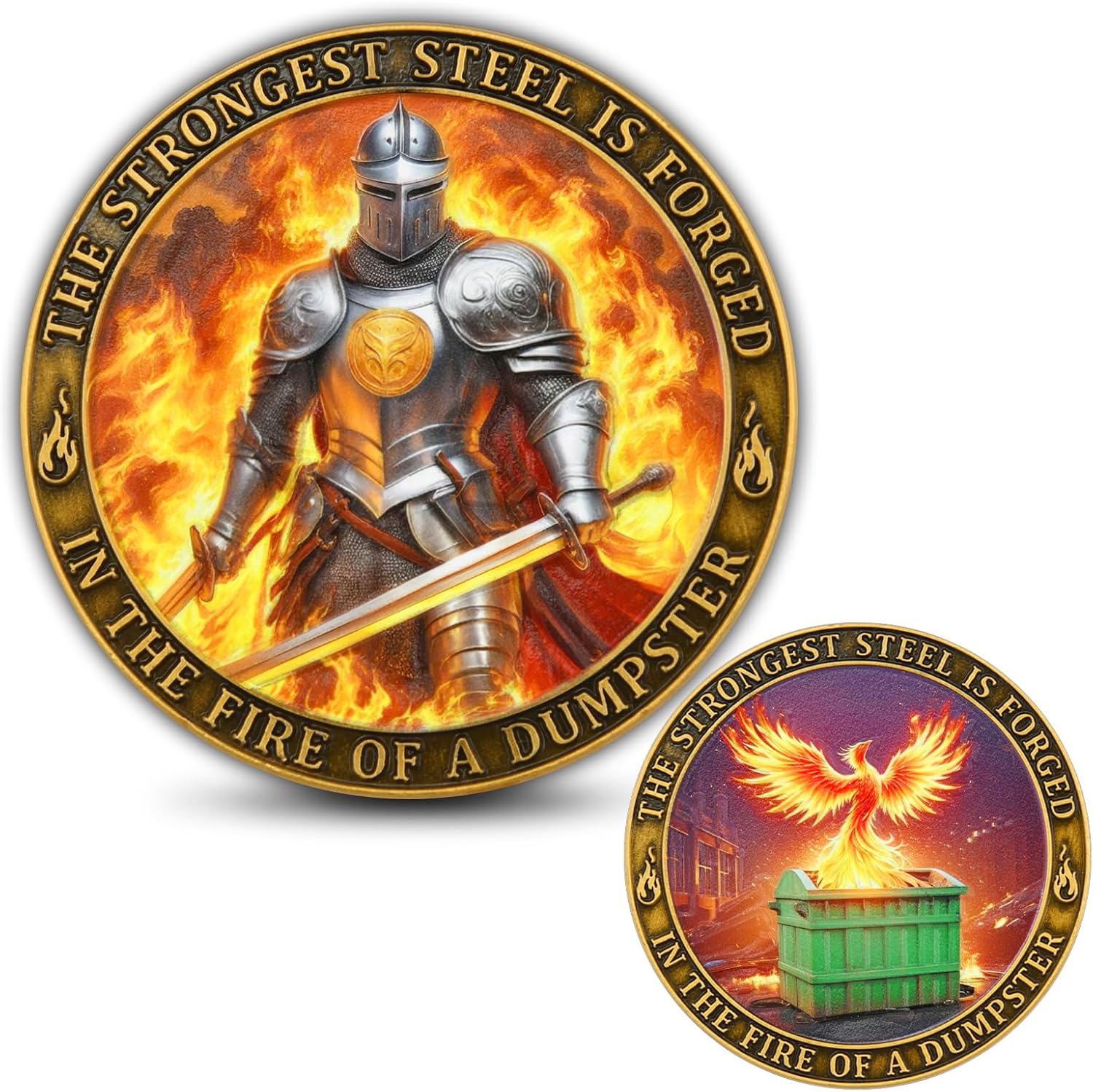 Rise stronger from chaos with this 5-pack of Dumpster Fire Challenge Coins, featuring powerful symbols of resilience, rebirth, and courage. The front of each coin showcases a phoenix emerging from flames, while the reverse displays a valiant knight with sword raised, representing the will to endure and overcome adversity. Crafted from premium metal with fine detailing and vivid enamel highlights, these coins combine durability with inspiring design. Each coin is individually packaged in a clear acrylic case for protection and easy display. Perfect for sharing encouragement with friends, teams, or colleagues, this 5-pack serves as a lasting reminder that even in chaos, strength and renewal rise from the fire.