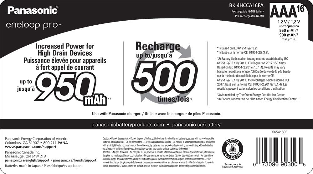 Panasonic BK-3HCCA16FA eneloop pro AA High Capacity Ni-MH Pre-Charged Rechargeable Batteries, 16 PackPanasonic eneloop pro high capacity Ni-MH “low Self discharge” batteries utilize Panasonic's advanced rechargeable battery technology providing up to 2550mAh (AA batteries)/ 950mAh (AAA) of power and the ability to be recharged up to 500 times. eneloop pro battery cells deliver consistent power performance, maintain 85% of their charge for up to one year, come pre-charged by solar power (at the factory) and are ready to use out of the package. These eneloop cells also have increased power, added storage life and extreme temperature performance down to -4 degrees Fahrenheit.Panasonic BK-4HCCA16FA eneloop pro AAA High Capacity Ni-MH Pre-Charged Rechargeable Batteries, 16 PackPanasonic eneloop pro high capacity Ni-MH “low self discharge” batteries utilize Panasonic's advanced rechargeable battery technology providing up to 2550mAh (AA batteries)/ 950mAh (AAA) of power and the ability to be recharged up to 500 times. eneloop pro battery cells deliver consistent power performance, maintain 85% of their charge for up to one year, come pre-charged by solar power (at the factory) and are ready to use out of the package. These eneloop pro cells also have increased power, added storage life and extreme temperature performance down to -4 degrees Fahrenheit.
