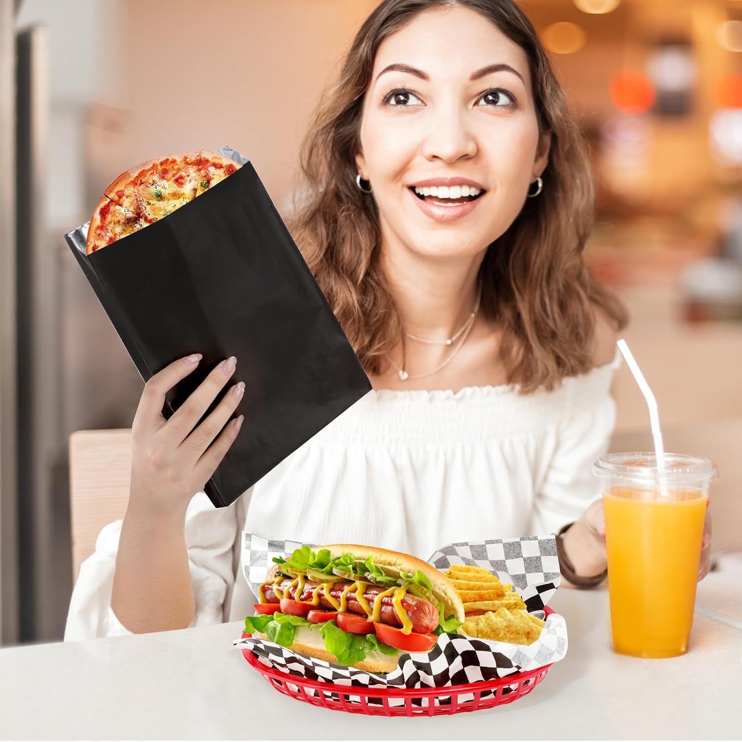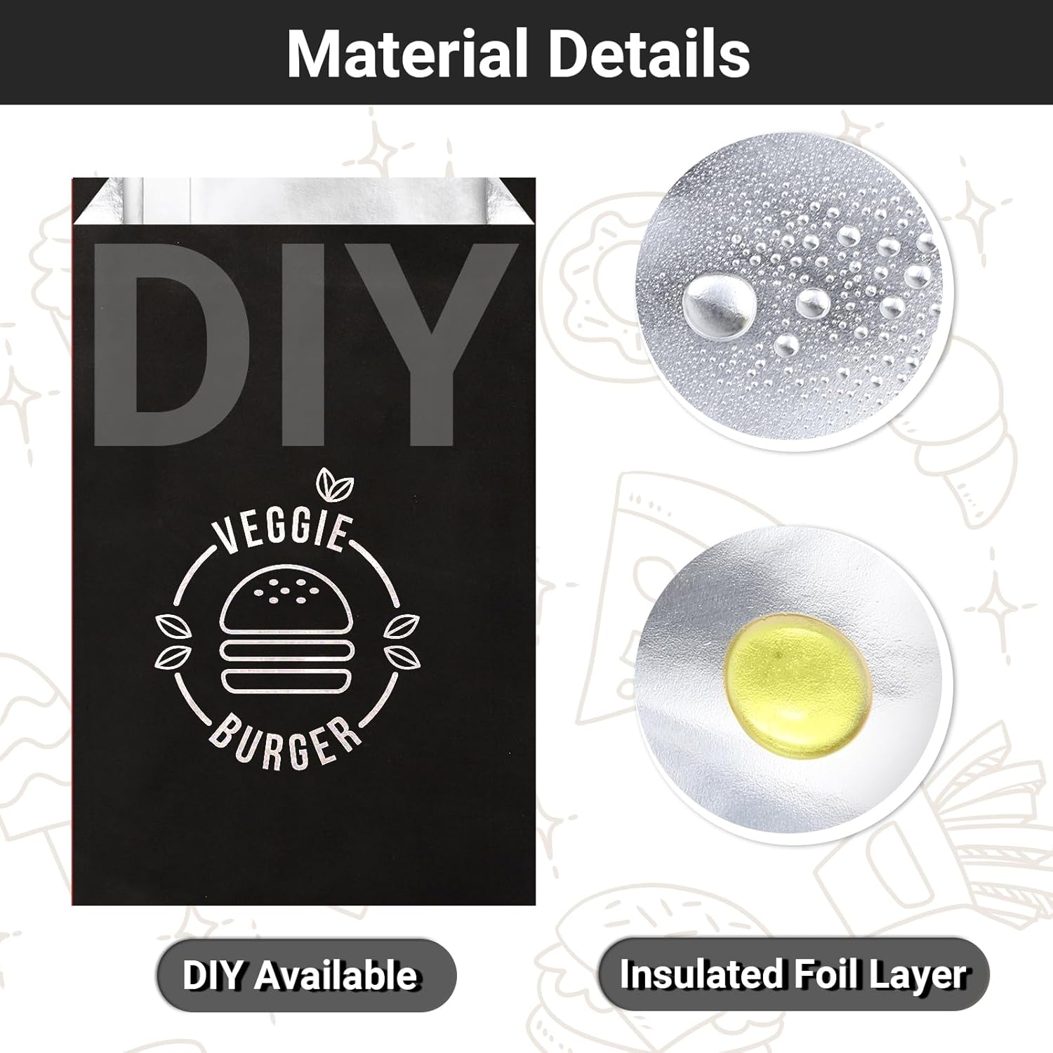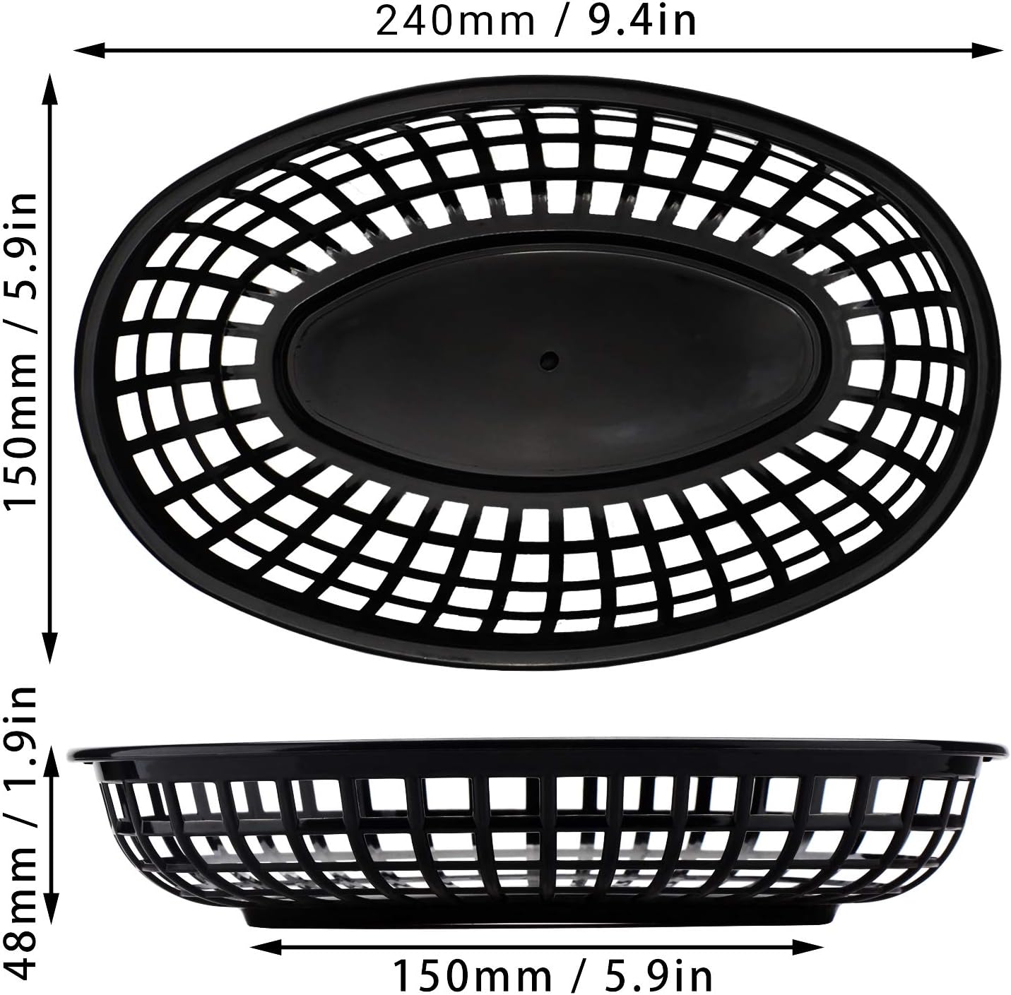 Product description: Material: plastic& aluminum foil paper Color:Black Features:Insulated, Large capacity Size:9.4" x 5.9"&10.3"x6.3"x1.6" Package List: 24 baskets+200 x Aluminum Foil Bags