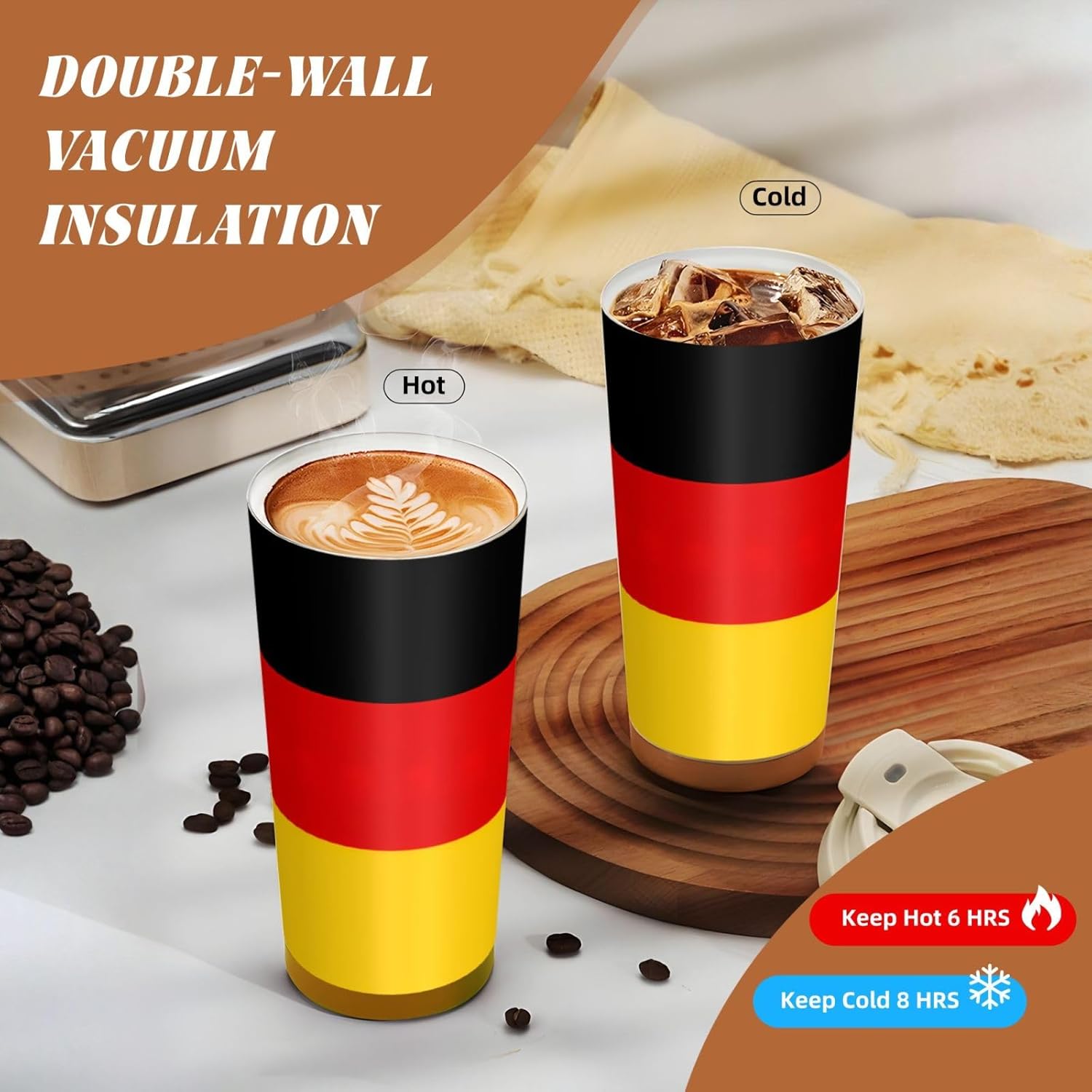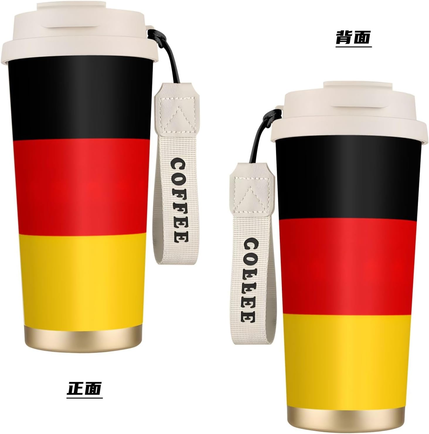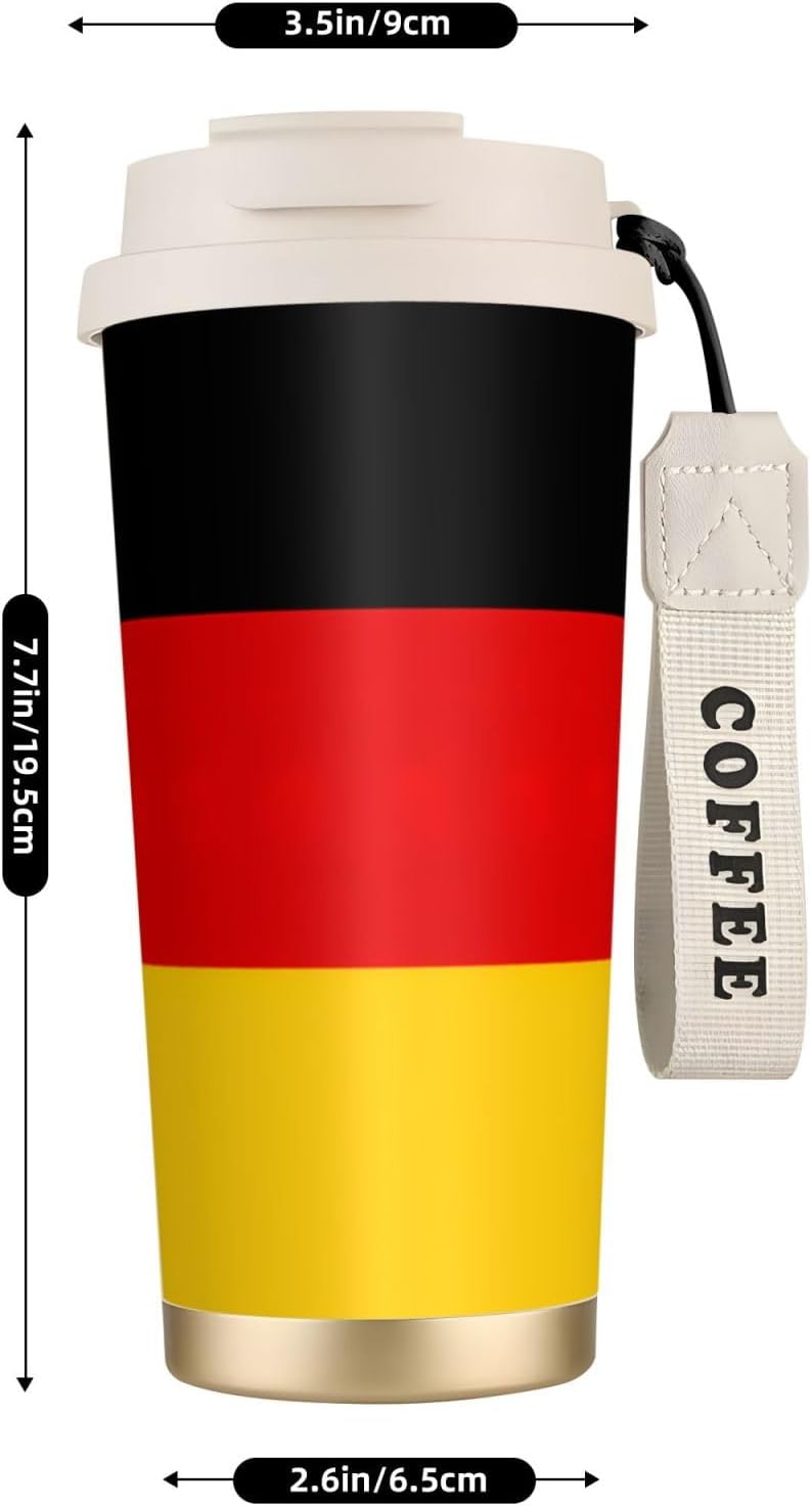 This German flag Print travel Coffee Mug supports three drinking modes: the direct drink spout for quick drinks during commutes, the straw port for iced coffee and other spill prone beverages, and the open top design that replicates the traditional coffee cup experience. BPA Free 316 Stainless Steel, Safe and Durable Inner liner made of food grade 316 stainless steel, non toxic, odorless, BPA free, safe for long term use.