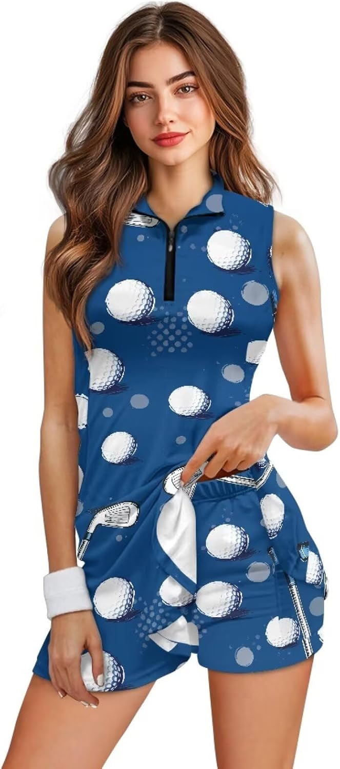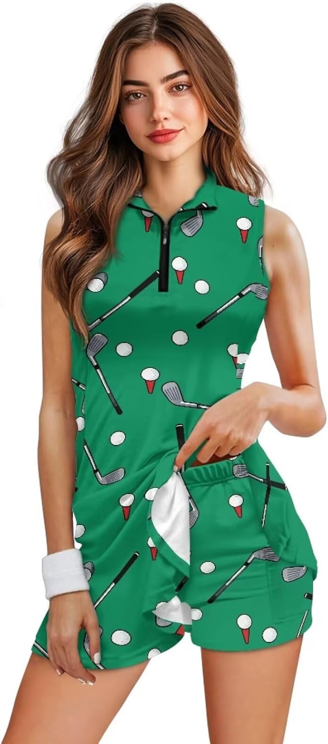 Womens Golf Dresses with Shorts Made from soft, stretchy polyester and spandex, this fabric gently hugs your body while allowing full freedom of movement. Designed to be breathable and moisture-wicking, it helps keep you cool, dry, and comfortable during intense workouts or hot summer days. This set includes a sleeveless v-neck dress with shorts. The functional pockets on the shorts are perfect for holding your phone, keys, tennis balls, or golf balls, giving you hands-free convenience both on and off the court. The dress length fully covers the shorts, featuring a quarter-zip design and an a-line silhouette that flatters your figure. Whether you're playing tennis, golfing, running, working out, hiking, traveling, or simply enjoying casual everyday wear, this outfit is a great choice. Please refer to our size chart carefully and select the perfect fit based on your bust and waist measurements. We also offer customization,submit your own image to be printed, creating a unique golf outfit. It makes a thoughtful and memorable gift for a daughter, friend, mother, or wife who loves golf—perfect for anniversaries, birthdays, or any special occasion.