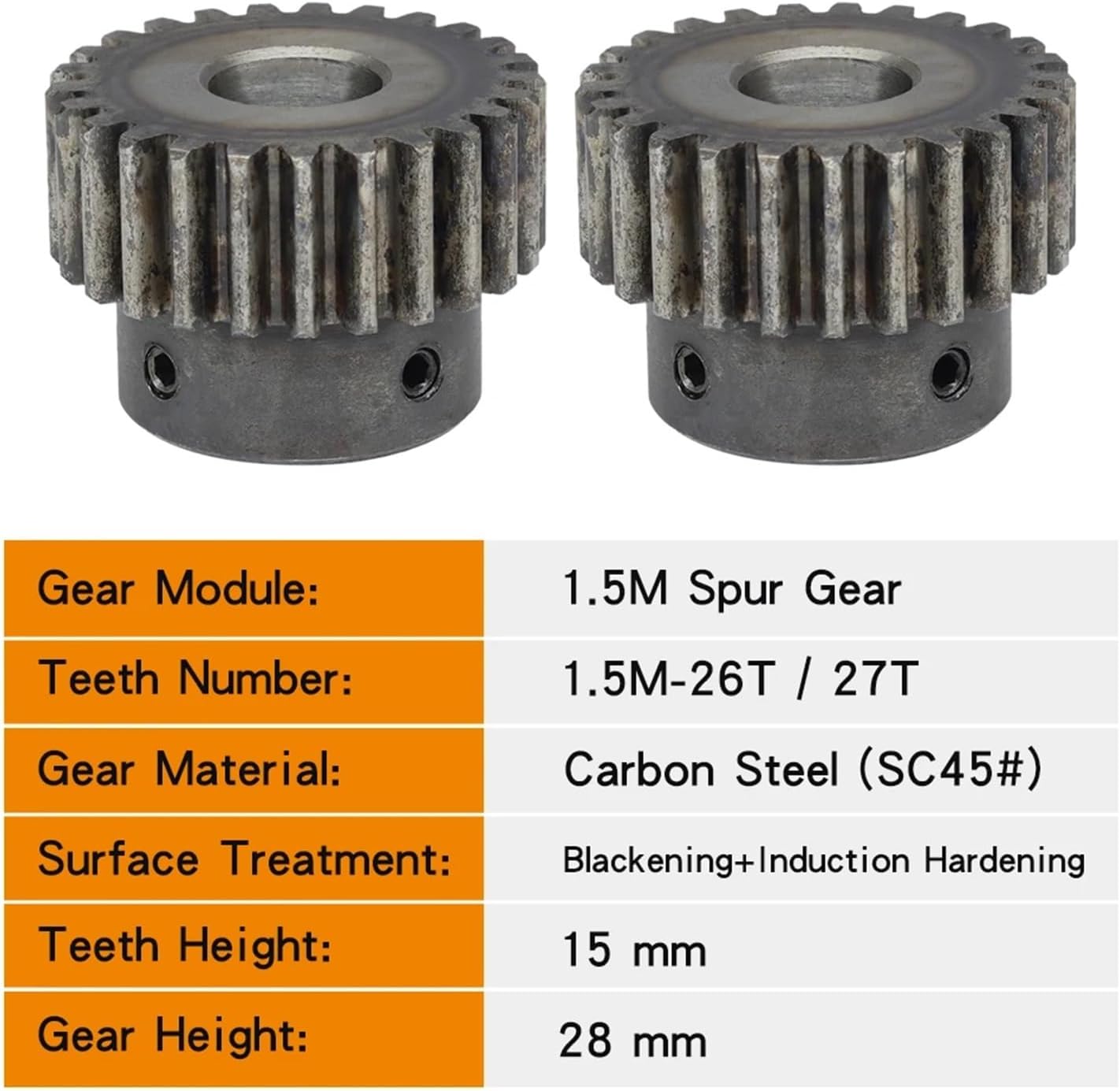 1. Not easy to wear, durable performance. This gear is a good industrial alternative accessory.2. Widely used in conveying, hardware, agricultural equipment, printing machinery, mechanical transmission and so on.3. The contact between the gears is firm to ensure the normal operation of the machine and good carrying capacity.Specification:1.Product Model : 1.5M-26T/27T2.Material : SC45#Carbon Steel3.Surface Treatment : High Frequency Quenching+Blackening4.Teeth Pitch : 4.71mm5.Teeth Depth : 3.375mm6.Teeth Height : 15mm7.Gear Total Height : 8mm8.Package :Spur Gear+M5*2