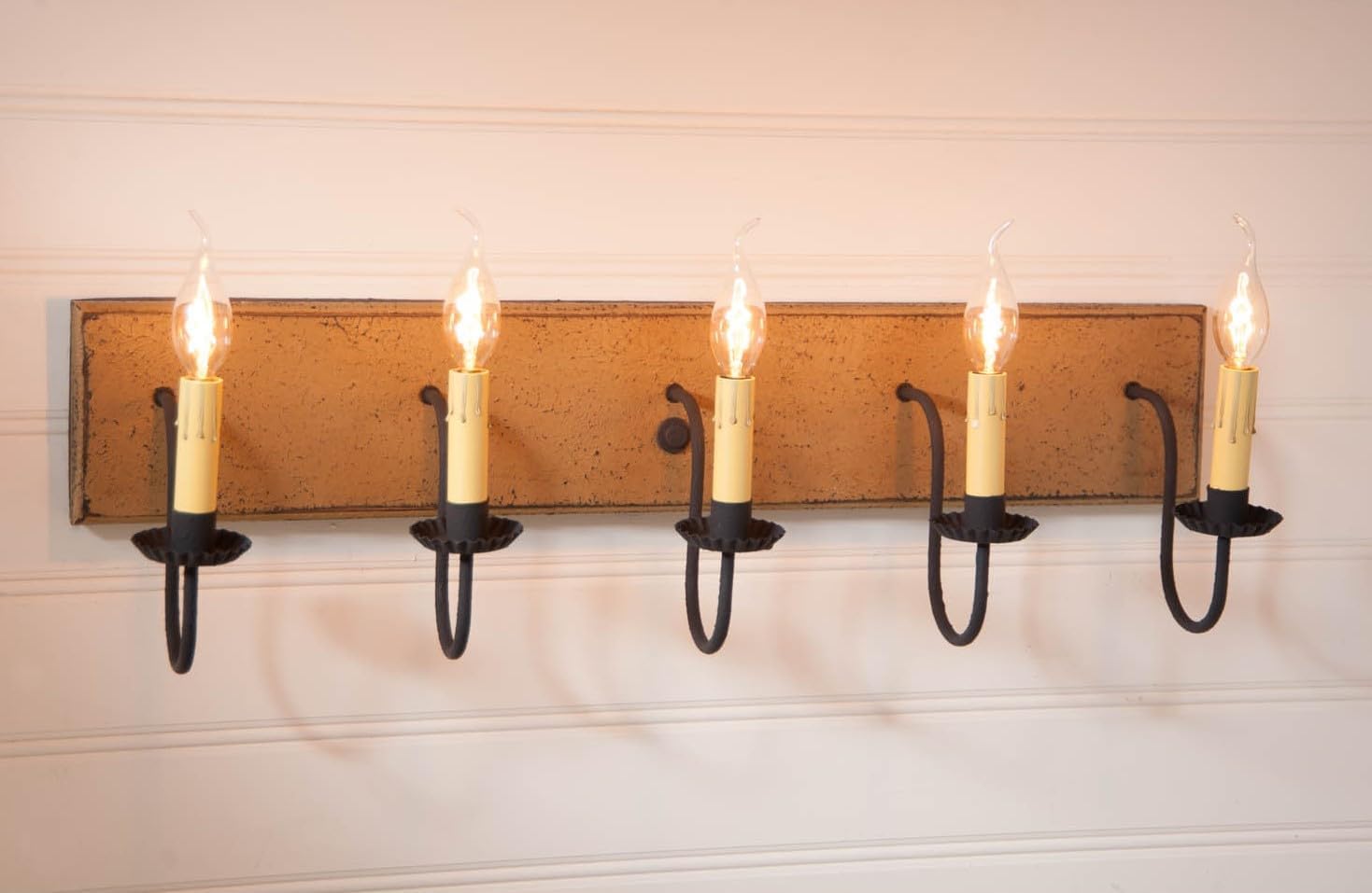 Designed in a sturdy homespun wood with a Textured Pearwood finish, the 5 Arm Vanity Light is the perfect decorating accessory. Equally at home above the sink in a powder room or above a hall setting of a mirror and table, it will produce plenty of light as it mirrors the homespun beauty of the past.Direct wired with five E12/Candelabra sockets, 60 watts max. per arm. Textured Black arms and crimped pans. Textured Pearwood painted body. Handcrafted in Pennsylvania. This vanity light is UL-CUL listed and has a 5 year guarantee.