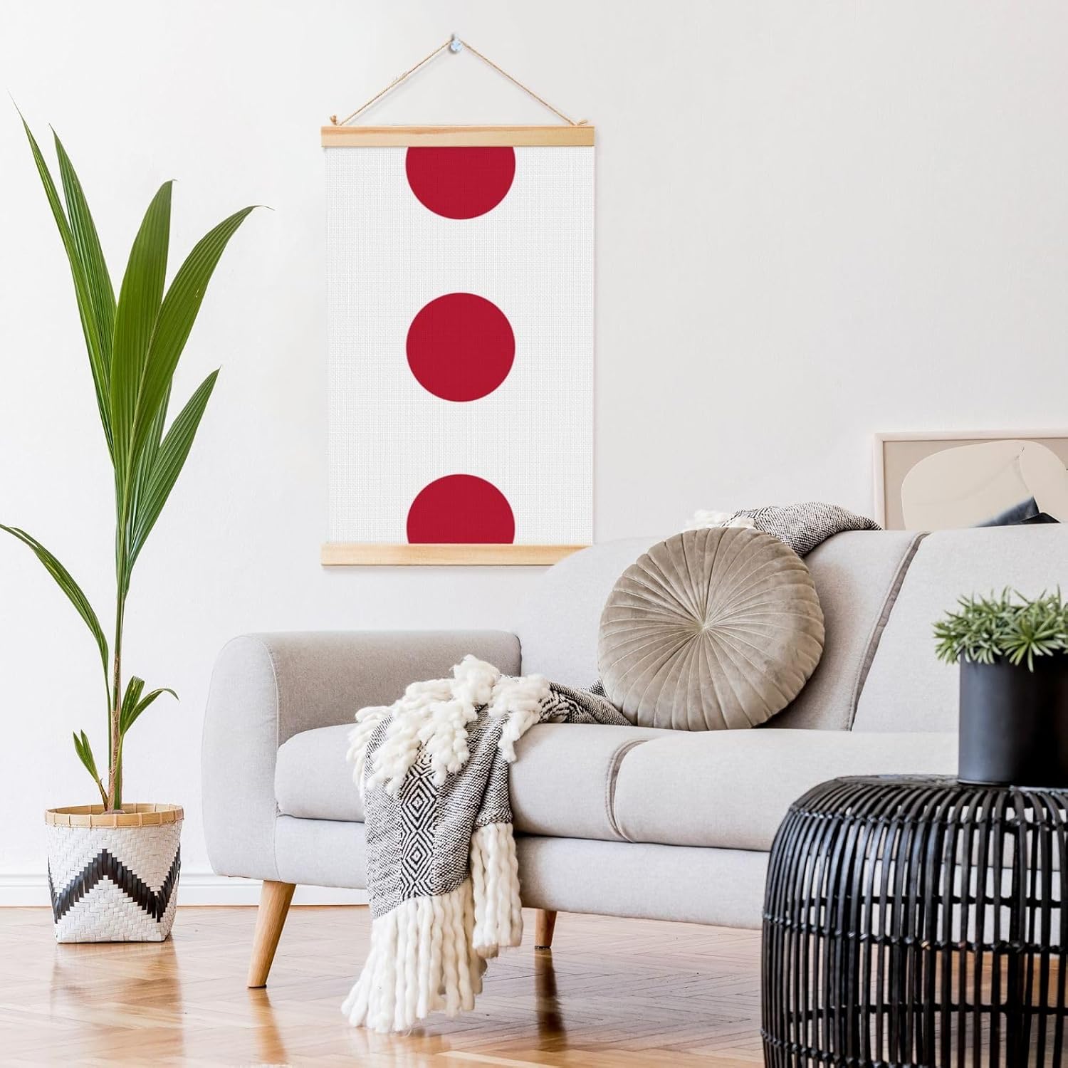 Our Japanese Flag Print Wooden Poster Hanger Is An Excellent Addition To Your Home Decor Or A Perfect Gift For Friends And Family. Made Of Selected Quality Canvas With Brilliant And Enduring Colors, This Wall Art Is Designed To Resist Water, Dust, And Fading, Ensuring The Bright And Vibrant Art Lasts. The Polyester Is Enclosed Between Two Teak Wood Hanger Scrolls With An Attached 35cm Rope For Easy Hanging. Installation Is Made Simple With The Included Two Nails In A Plastic Box. The Modern Minimalist Style Of Our Wall Hanging Complements Any Home Decor, Elevating The Artistic Ambiance And Brightening Up The Room. Experience The Elegant Transformation This Wall Hanging Scroll Painting Brings To Your Spaces Today.