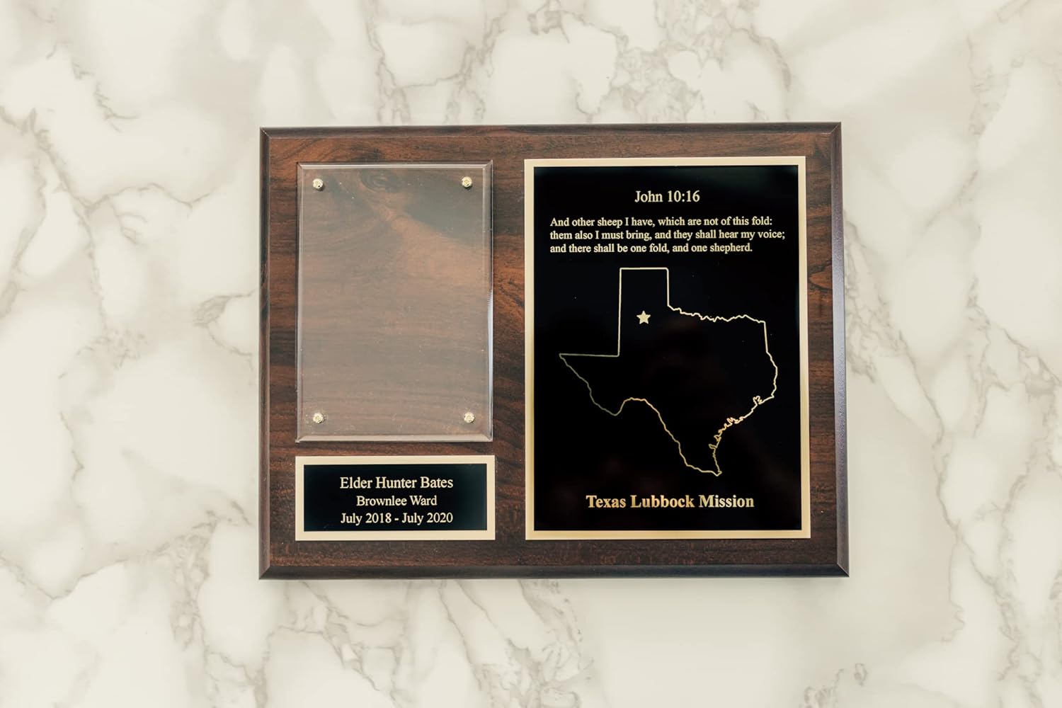Handcrafted 8 x 10 missionary plaque made from cherry finish, red alder, or solid walnut wood. The plaque includes space for a 3.5 x 5 inch photograph, the missionary’s name, home ward, service area, mission scripture, and mission geography. The photograph is mounted behind a beveled plastic cover and secured with four metal screws. Each plaque includes two engraved plates. The smaller plate (1.5 x 3.5 inches) is engraved with the missionary’s name, home stake and ward or district and branch, and dates of service. The larger plate (6.75 x 4.875 inches) is engraved with a selected scripture, mission location, and a map of the mission area with a marked mission home. Customer-provided photographs are printed and installed during production. All engraving is completed exactly as entered at the time of order.