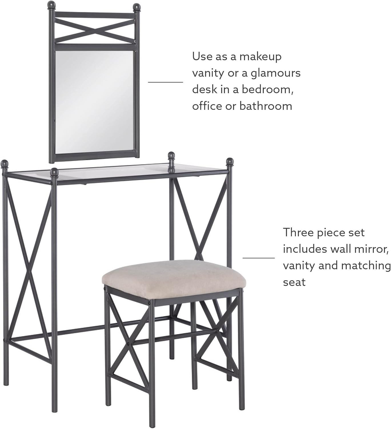 The Mission Hills Vanity Set is a classic addition to any bedroom. Perfect for a range of decor styles; the vanity has a cement colored finish. A matching stool features a plush neutral microfiber seat for comfort. The spacious glass top is ideal for store.