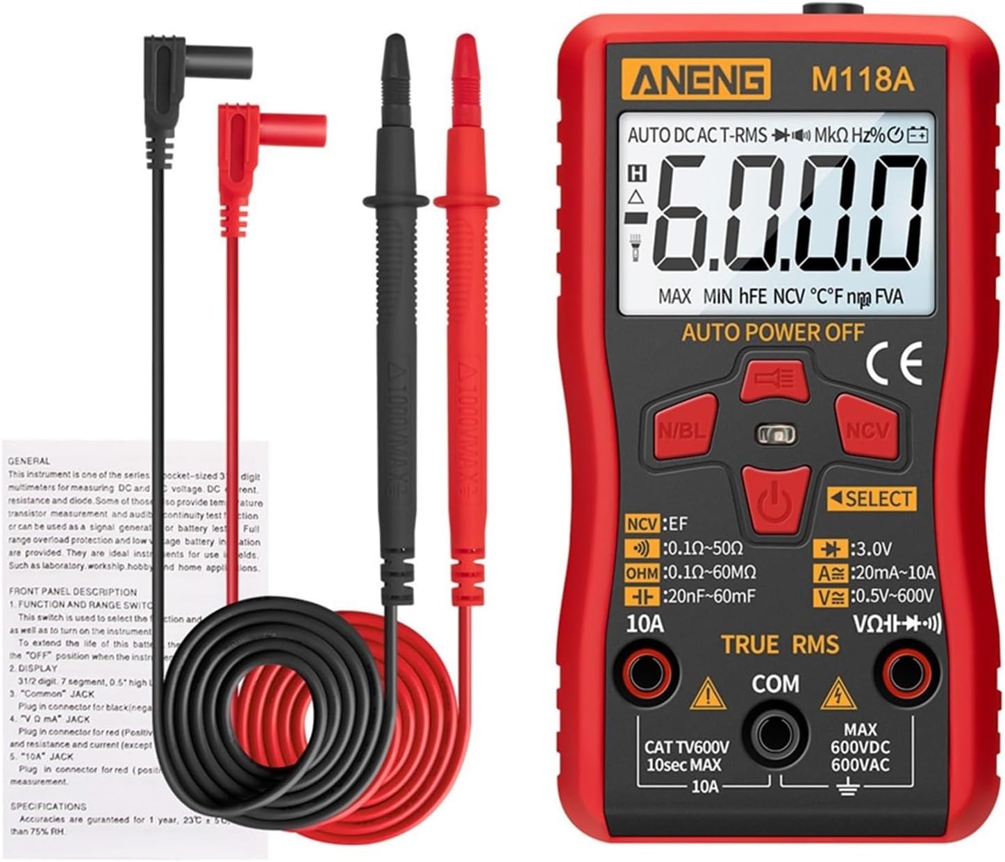 Multimeters & AnalyzersM118A6000 Counts True RMS Digital MultimeterFeatures:Model Number: M118ADisplay:6000 countsDIY Supplies: ElectricalOperating Mode: AutomaticDC Voltage Range: 0.5V~600VAC Voltage Range: 0.5V~600VAC Current Range:20mA/10ADC Current Range: 20mA/10AMeasuring Resistance Range: 0.1~50 OhmDisplay Type: Digital DisplayFlash Light, Back light,Auto-power OffNCV test,TRUE-RMS,Data HoldSample Rate: 3 times per secondPacking List:1 * Digital Multimeter1 * Test leads1 * English user Manual==========Operating Mode : AutoMeasuring Capacitance Range : M118A Digital Mini MultimeterOperating Temperature : 0 - 40 DIY Supplies : ELECTRICALMeasuring Resistance Range : 0.1~50 OhmModel Number : M118A Digital Mini MultimeterMeasuring Inductance Range : MultimeterDimensions : MultimeterDC Current : 20mA/10AAC Current : 20mA/10AAC Voltage : 0.5V~600VDC Voltage : 0.5V~600VDisplay Type : Digital display