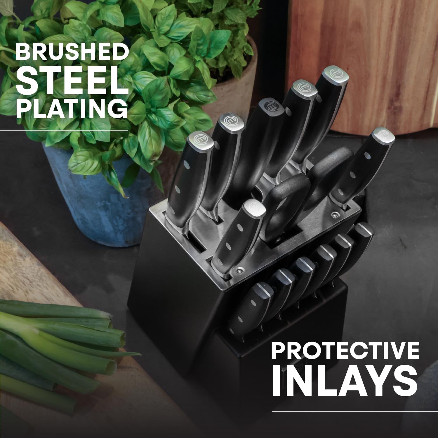 MASTERCHEF APPROVED FROM STUDIO TO KITCHEN: Approved by the MasterChef team and used by Season 12 contestants, this professional 15-piece collection has been engineered with precision, style and performance in mind. Made of X50Cr15MoV stainless steel, these high-carbon knives feature triple riveting handles, hand-sharpened corrosion-resistant blades and a stainless steel bolster to provide an optimal balance between handle and blade to meet all your preparation needs.