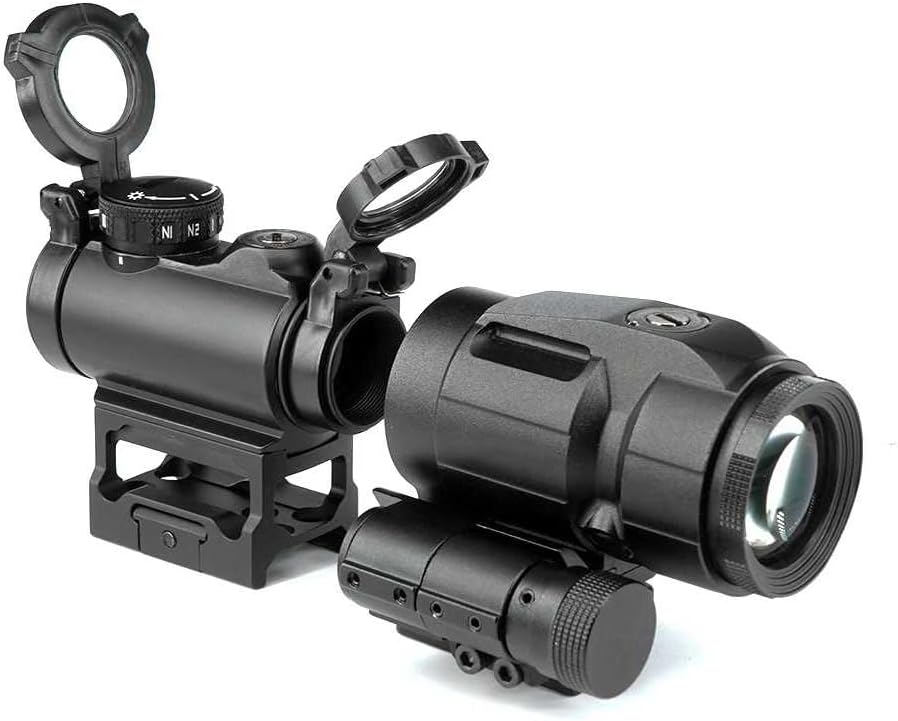 Red Dot Sight:- Standard-performance lens coatings for Suitable light transmission and dot contrast in Many situation.- compact size and weight with eye relief and parallax-free operation.- Suitable 2 MOA Dot- Slipover,see-through flip-backs- 1.41" Skeletonized lightweight Riser Mount for absolute co-witness- Top loading battery compartment with integral brightness control featuring 10 daytime and 2 NV settings- Over 20,000 hours runtime on battery- Aircraft-grade aluminum housing and mount- IPX-7 and fog-proof performance3X Magnifier:Magnification: 3 xObjective Lens Diameter: 22 mmLength: 108 mmWeight: 12.5 ozField of View,Angle: 8 degreesFabric/Material: CNC AluminumHeight: 70 mmColor: Black Exit Pupil: 8 mmDiopter Adjustment Range:-2 - 2 dpt