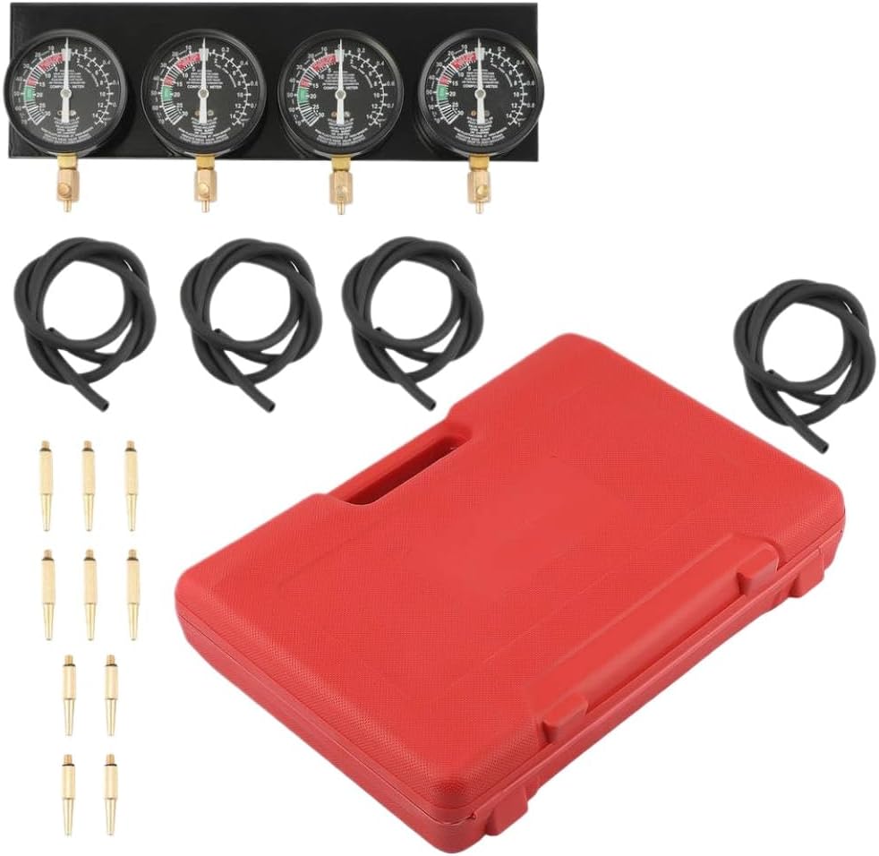 Motorcycle Carb Synchronizer Balancer Tool Kit w/ 4 Gauges & Universal Adapters Universal for most standard carburetors to synchronize and adjust the values of four carburetors. Features: Length of rubber pipe: 30 in / 74 cm Length of plate: 15.6 in / 40 cm Adapter sizes: 1.96 in / 5 cm, 2.4 in / 6 cm, 3.9 in / 10 cm, 6.7 in / 17 cm Package includes: 4 synchronizers with fixed plates (vacuum) 4 rubber pipes (8 mm x 5 mm x 750 mm) 4 extension tubes (3.9 mm x 52 mm) 4 extension tubes (3.9 mm x 122 mm) 8 tubes with conical type connectors (8 mm x 40 mm) 4 tubes (10 mm x 53 mm, M6 x 0.75) 4 tubes (10 mm x 60 mm, M6 x 1.0) Enables holding vacuum values during use. Provides higher corrosion resistance and better flow accuracy. Fast diagnosis of improper timing, valve sticking, manifold leakage, improper fuel mixture, and spark misfire. Allows synchronization and adjustment of four carburetors. Each gauge has individual damping control and calibration control. Applicable to vehicles with vacuum measuring joints. Constructed from materials for extended service life. This component is produced by an independent manufacturer.Brand names are used for compatibility illustration.
