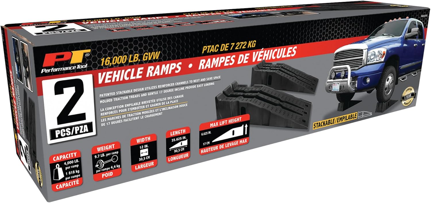Safely and easily perform maintenance and repairs under your vehicle with the Performance Tool W41014 Stackable Vehicle Ramps. These heavy-duty ramps boast a 16,000 lb. total gross vehicle weight capacity and a gentle 17-degree incline for easy loading, even with low-clearance vehicles. The patented stackable design saves valuable garage storage space, and the slip-resistant rubber feet and raised stop end ensure stability during use. Constructed from durable polypropylene, these ramps are built to last.
