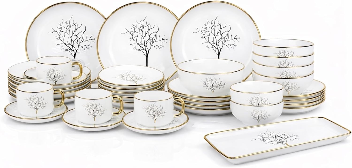 Upgrade your table setting with this Premium 32-Piece Porcelain Dinnerware Set, Service for 6. Each piece is crafted from durable, high-fired porcelain and finished with a refined gold rim that adds timeless elegance to your dining experience. This complete dish set for 6 includes dinner plates, salad plates, bowls, cups, and saucers, making it perfect for everyday meals, family gatherings, or special occasions. Designed to be both beautiful and practical, this luxury porcelain dinnerware set is chip-resistant and dishwasher safe, ensuring long-lasting quality with effortless cleanup. The classic yet modern design makes it ideal for weddings, housewarmings, or holiday gifting.