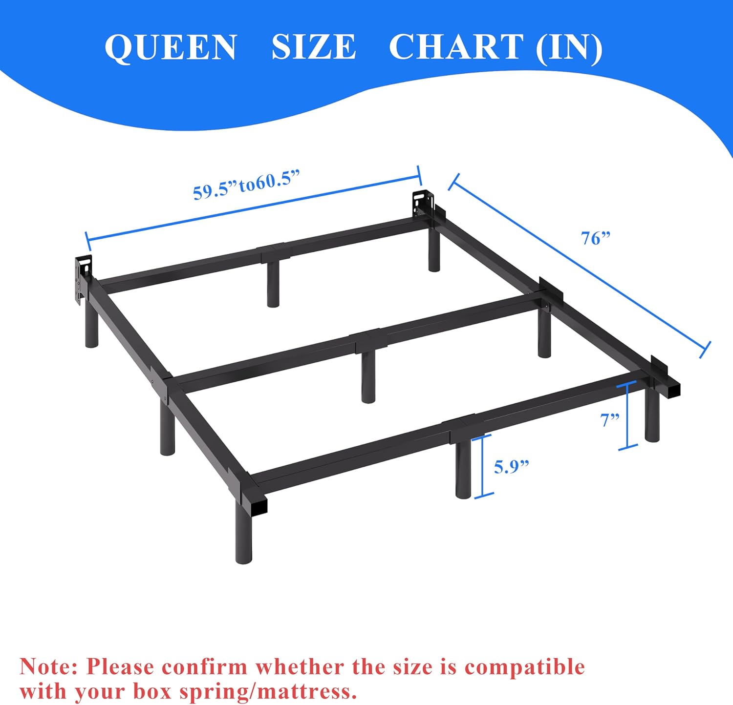 Experience reliable support and lasting durability with the QQNNQIANG Queen Bed Frame. Designed to provide a sturdy, silent base for your mattress and box spring, this 7-inch metal frame combines robust construction with a clean, modern profile. Ultra-Stable 9-Leg Support: Features a reinforced center support bar with additional legs, offering superior stability and preventing mattress shift or frame wobble. Supports substantial weight capacity for peace of mind. Noise-Resistant, Quiet Sleep: Constructed from high-grade, thickened steel with secure bolt connections and reinforced joints. The design minimizes metal-on-metal contact to reduce squeaking and noise for an undisturbed night's rest. 7-Inch Practical Height: Provides ample under-bed storage space for bins, suitcases, or organizers, helping you maximize bedroom space and maintain a tidy environment. Enhanced Mattress Protection: The closely spaced supportive slats and sturdy grid base work together to properly hold your box spring and mattress, promoting even weight distribution and helping to prevent premature wear. Universal Compatibility: Perfectly sized for a standard queen mattress (60"W x 80"L). Designed to work seamlessly with your existing box spring and mattress set, requiring no additional foundation. Durable & Scratch-Resistant Finish: The sleek black coating is not only stylish but also resistant to chipping and scratches, ensuring the frame maintains its look over time. Product Specifications: Overall Dimensions: 60.5" W x 80.5" L x 7" H Mattress Size Compatibility: Queen (Fits 60" x 80" mattress) Material: Heavy-Duty Steel Color: Black Weight Capacity: Supports significant weight (exact limit refer to manufacturer's specifications) Included Components: All metal frame parts, connecting hardware, and an instruction manual. Upgrade your bedroom foundation with the QQNNQIANG Metal Bed Frame – where sturdy support meets simple style and effortless assembly.