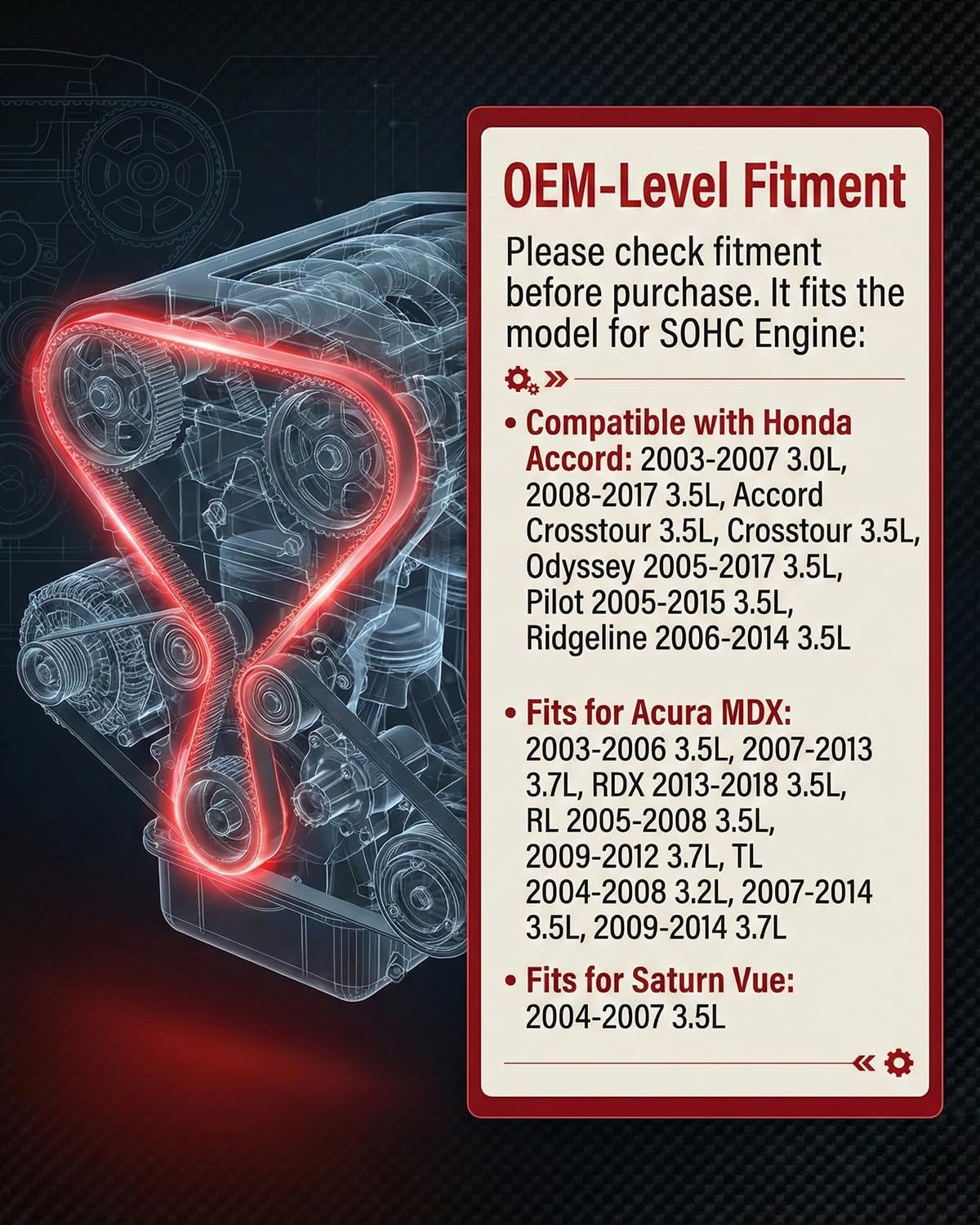| Included Components | 1*Timing Belt ,1*Serpentine Belt ,1*Water Pump with Gasket, 1*Hydraulic Tensioner, 1*Tensioner Pulley, 1*Idler Pulley, 2*Camshaft Seals, 1* Crankshaft Seal |