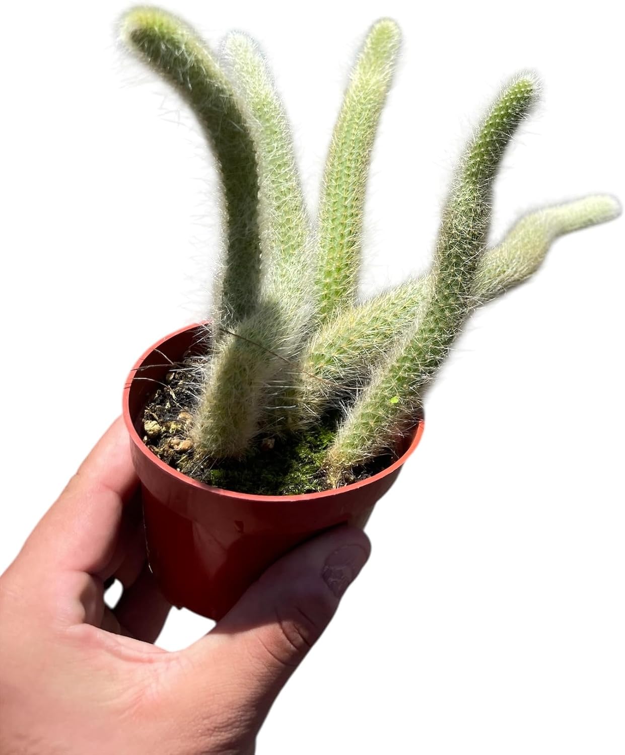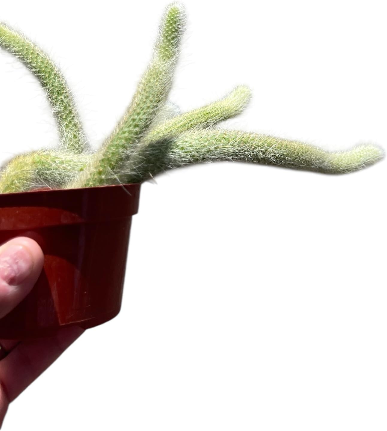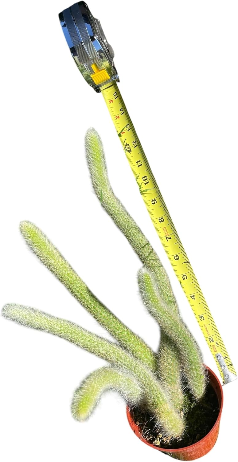 The Monkey Tail Cactus is a striking and unusual cactus known for its long, trailing stems covered in soft, white, hair-like spines—resembling a monkey’s tail, hence its name. Native to Bolivia, this epiphytic cactus thrives in mountainous regions and is prized for its unique appearance and ease of care. Its stems can grow up to 3 feet (90 cm) long, arching or hanging gracefully over the sides of containers or hanging baskets. During spring and summer, the Monkey Tail Cactus produces vibrant, tubular red flowers that contrast beautifully with its fuzzy stems, adding a splash of color to its already eye-catching look. This cactus prefers bright, indirect light and well-draining soil. It’s drought-tolerant and should be watered sparingly, allowing the soil to dry out between waterings. With the right care, it becomes a stunning focal point in any indoor garden or succulent collection.