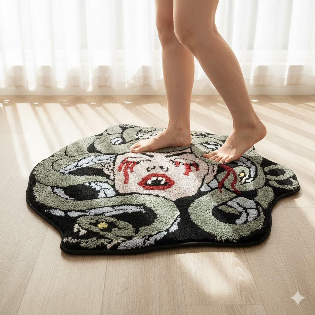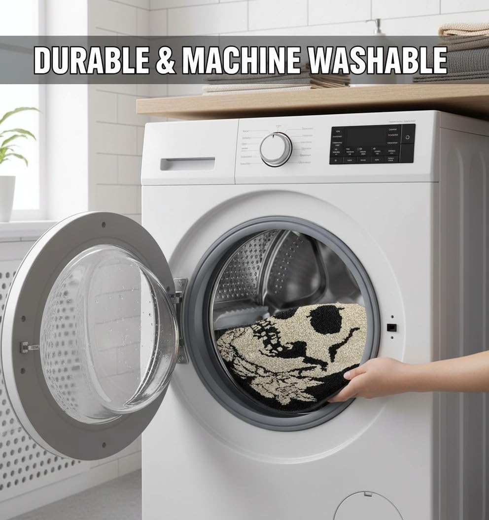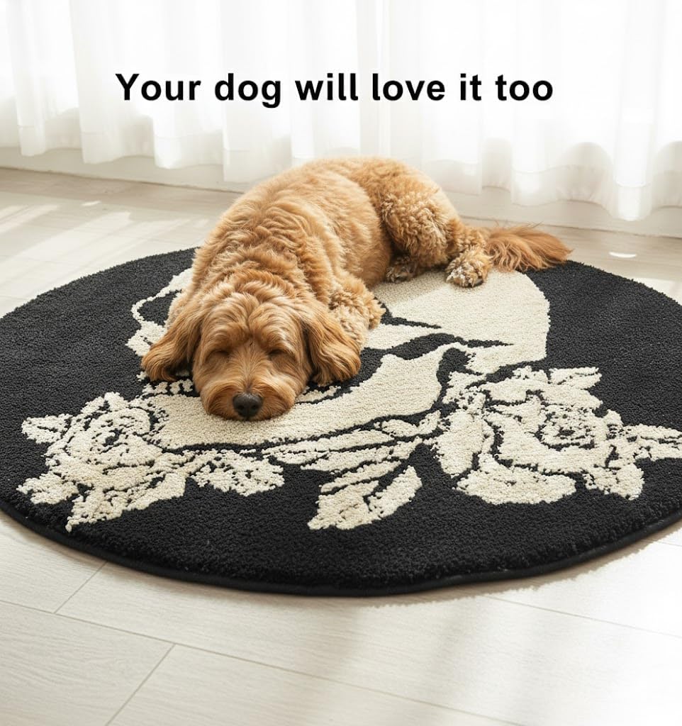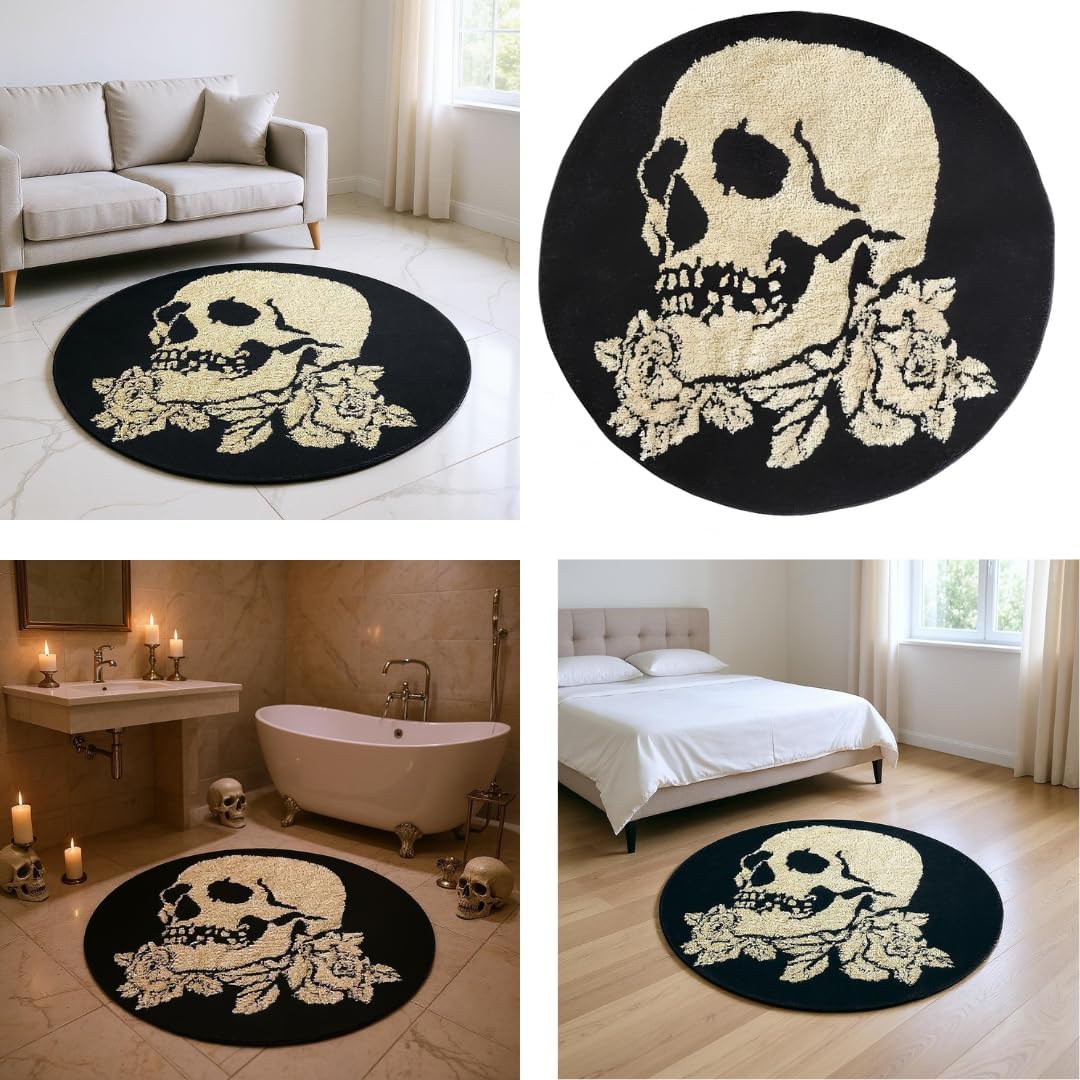 Transform your space with this striking area rug featuring a bold skull and rose design that makes a dramatic statement. Measuring 31 x 31 inches, this round-shaped rug combines edgy gothic style with practical functionality. The medium-pile polyester construction offers plush comfort underfoot while maintaining durability for everyday use. The thermoplastic rubber backing ensures the rug stays securely in place on your floor. Machine-made with a tufted weave, this versatile piece works beautifully in living rooms, bedrooms, entryways, or any area needing a touch of rebellious sophistication. The absorbent material and practical size make it suitable for various settings. The eclectic design incorporates deep reds and striking details that create a focal point in any room. Easy to maintain and built to last, this distinctive rug adds character and comfort to your living space while reflecting your unique style. Perfect for those who appreciate bold, unconventional home decor with an edge.