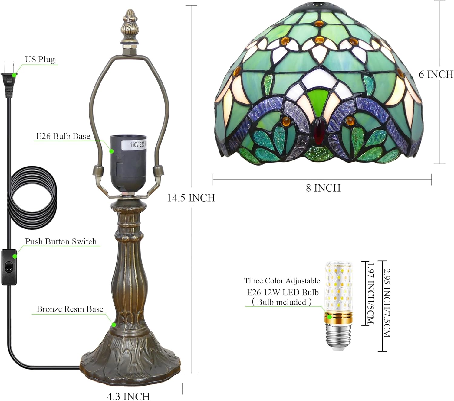 | Included Components | Stained Glass Lampshade, Resin Base, E26 LED Bulb |