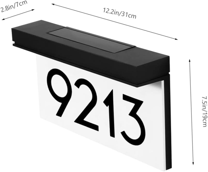 Package Include 1 × Solar Light Features - Continuous lighting time: 6-12 hours House Numbers -Material: Plastic Solar Wall Light -Color: Black House Numbers Solar Powered - Light source: LED Solar Wall Lamp - Voltage: 5V Address Sign - Rated power: 30 Numbers for Outside - Protection class: IP65 LED Lighting Tool - Supply mode: Solar power Solar Lighted Address Sign - Charging time: 4-6 Solar Address Sign -Size: 31.00X19.00X7.00cm/12.18X7.47X2.75in Solar Door Number Light -It can absorb sunlight and light the road at night, and Address Numbers Signs. -The workmanship makes it durable and waterproof, practical for outdoor use Solar House Number Lamp. Specification Doorplate Light -Wide range of application, it is suitable for outdoor, such as patio, garden, yard, porch, pathway and so on House Indicating Lights. -This solar address sign makes your address number more visible in the dark Courtyard Light. -The solar light is easy to use and install, bring much convenience to your daily life Outdoor Solar Light.Goods DescriptionDoorplate Light Solar charging, and convenient, charging during the day, and light at night.Solar House Number is made from material for long time and durable use.Solar Wall Light The solar light is easy to use and install, bring much convenience to you