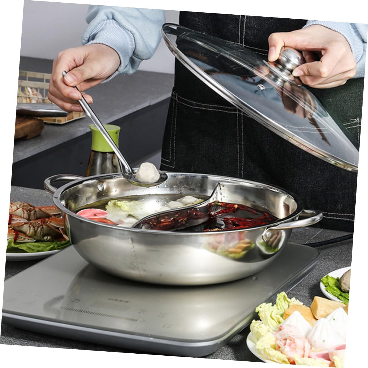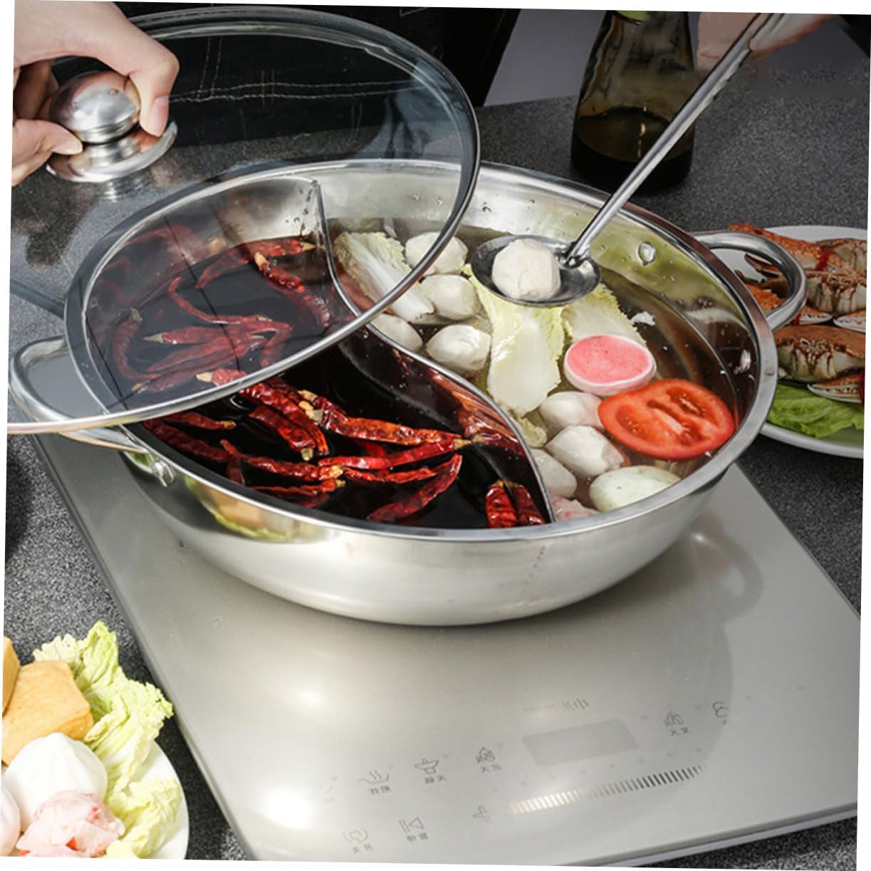 Package Include 1 Pot Cooker with Cover Features -Color:Silver hot pot pan with divider -Material:Stainless steel, glass Divided Hot Pot -Size:34.00X34.00X12.00cm/13.36X13.36X4.72in pot -The Divided Hot Pot is sturdy, wear- , -proof and to deform or break hot pot hot pots. -Easy to use and operate due to its polished surface, Hot Pot is very convenient to clean Kitchen Hot Pot. -The handle is strong and firm, to break, easy to hold, and will not hurt your hands induction pot. -The interior is smooth, the pot is easy to clean and reusable, can use it with confidence divided cooking pot. - craftsmanship and and details hot pot .Goods Informationhotpot pot with divider This Hot Pot, made of glass and stainless steel materials, and to use.cooking pot divider The divider design allows you to cook hot pot of different flavors, can meet different taste at the same time.hot pot Equipped with handle design, you can easily used.Household Hot Pot Suitable for family, friends gatherings and hot pot restaurants