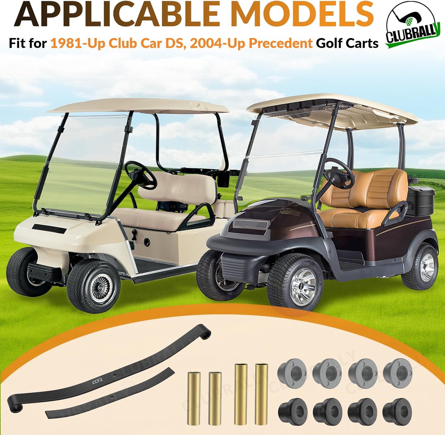 | Included Components | 1×Club Car Front Leaf Spring, 8×Leaf Spring Bushings, 4×Bushing Steel |