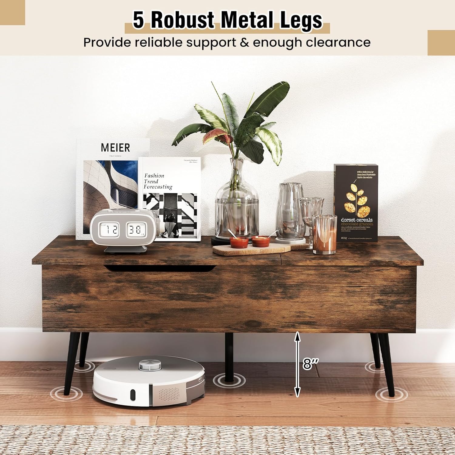 DescriptionTransform your living room with our chic lift-top coffee table! Designed to blend functionality with style, this must-have centerpiece features a smooth, silent lift mechanism and a dual compartment for tucking away everything from remote controls to magazines. Craving comfort? With a simple lift, use it for dining or as a laptop desk without leaving your couch. Built on 5 sturdy metal legs with non-slip pads, it ensures excellent stability and scratch-free floors, maintaining both elegance and practicality. Plus, its mid-century charm with an elegant wood grain finish will upgrade your space instantly. Make your space smart, sleek, and clutter-free today!FeatureLifting split top for versatile use beside the couch Premium gas struts ensure smooth lift, strong support and quiet operationSuperior to those with squeaky and wobbly spring mechanism2 hidden compartments help you to keep the living space clutter-freeAmple storage space for books, snacks, remote controllers and charging adapters5 robust metal legs provide reliable support and enough clearanceUser-friendly design with safety and convenience in mindAnti-pinch cut-out handles for safe liftingNon-slip foot pads reduce unsightly scratchesSmooth finish for easy cleaningAssembly neededSpecificationColor: Walnut + White + Gold/Black/Rustic Brown + BlackMaterial: Engineered Wood, MetalOverall Dimensions: 44” x 19” x 15.5” (L x W x H) Height of Lifted Tabletop: 21” Dimensions of Large Compartment: 26” x 15.5” x 6.5” (W x D x H) Dimensions of Small Compartment: 14” x 15.5” x 6.5” (W x D x H) Off Ground Clearance: 8” Net Weight of Closed Tabletop:165 lbsWeight Capacity of Each Lifted Tabletop: 55 lbsWeight Capacity of Large Compartment: 90 lbsWeight Capacity of Small Compartment: 55 lbsNet Weight: 39 lbsPackage Includes: 1 x Lift Top Coffee Table1 x User Manual