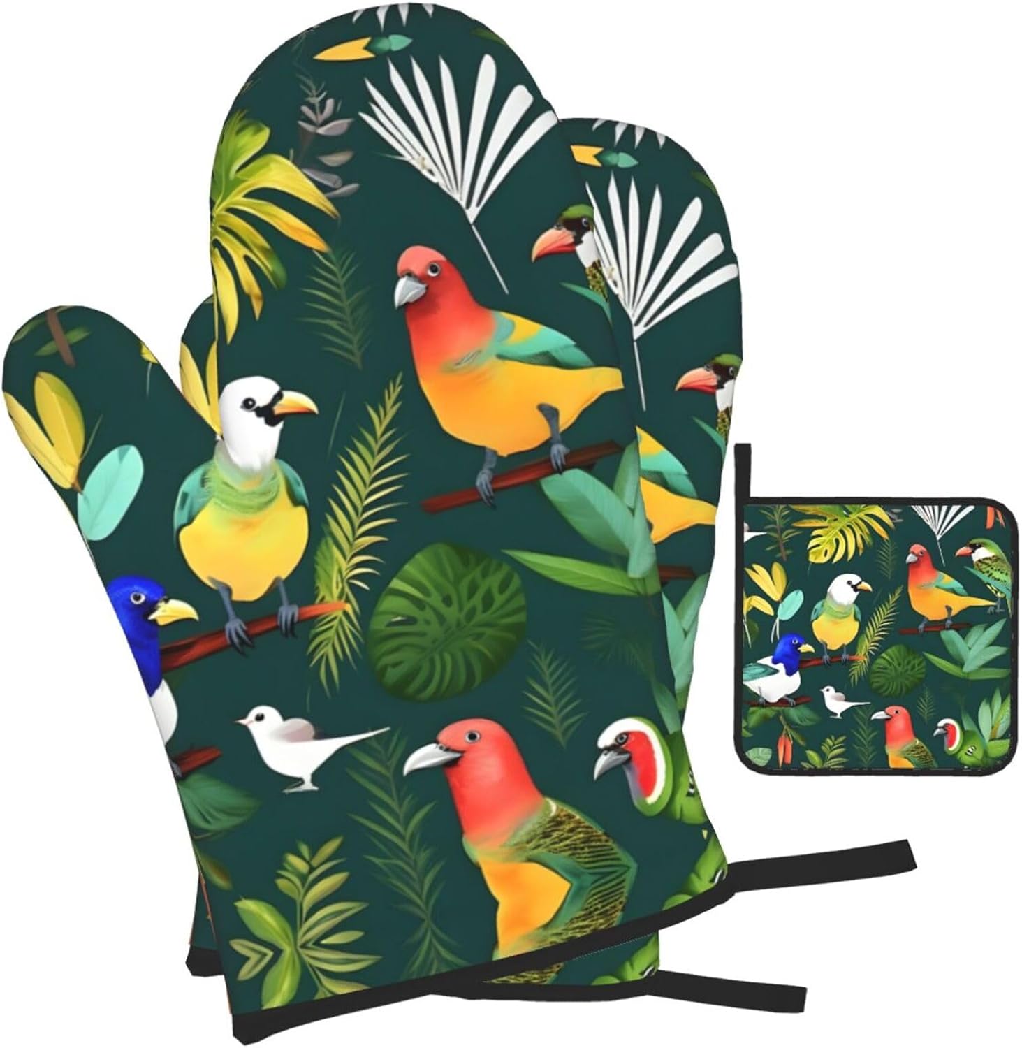 upgrade your kitchen safety with this Tropical Birds and Plant Leaf print microwave gloves, oven mitts and pot holders sets. crafted from water repellency polyester and heat-resistant fabric, these kitchen baking three piece set offers reliable protection for hands while handling hot items. the double-layer waterproof design ensures easy cleaning after use. suitable for various cooking scenarios including microwave ovens, conventional ovens, stovetop cooking, and outdoor grilling. the side hanging rope allows convenient storage when not in use. the thick construction provides excellent heat insulation without compromising dexterity. this unisex kitchen essential combines functionality with practical design for everyday cooking needs. the heat-resistant gloves maintain comfort while offering superior protection against burns. an essential addition to any modern kitchen setup
